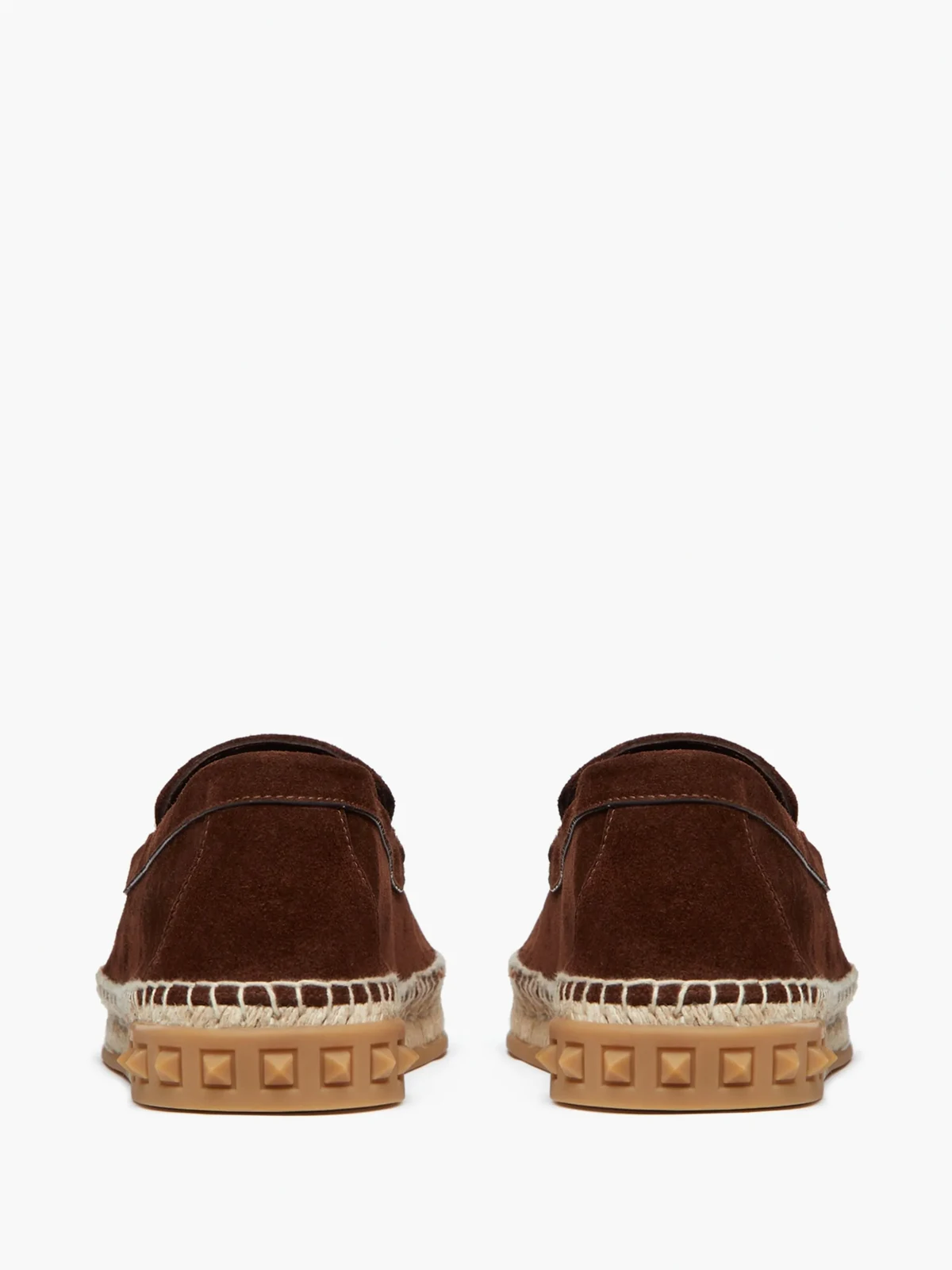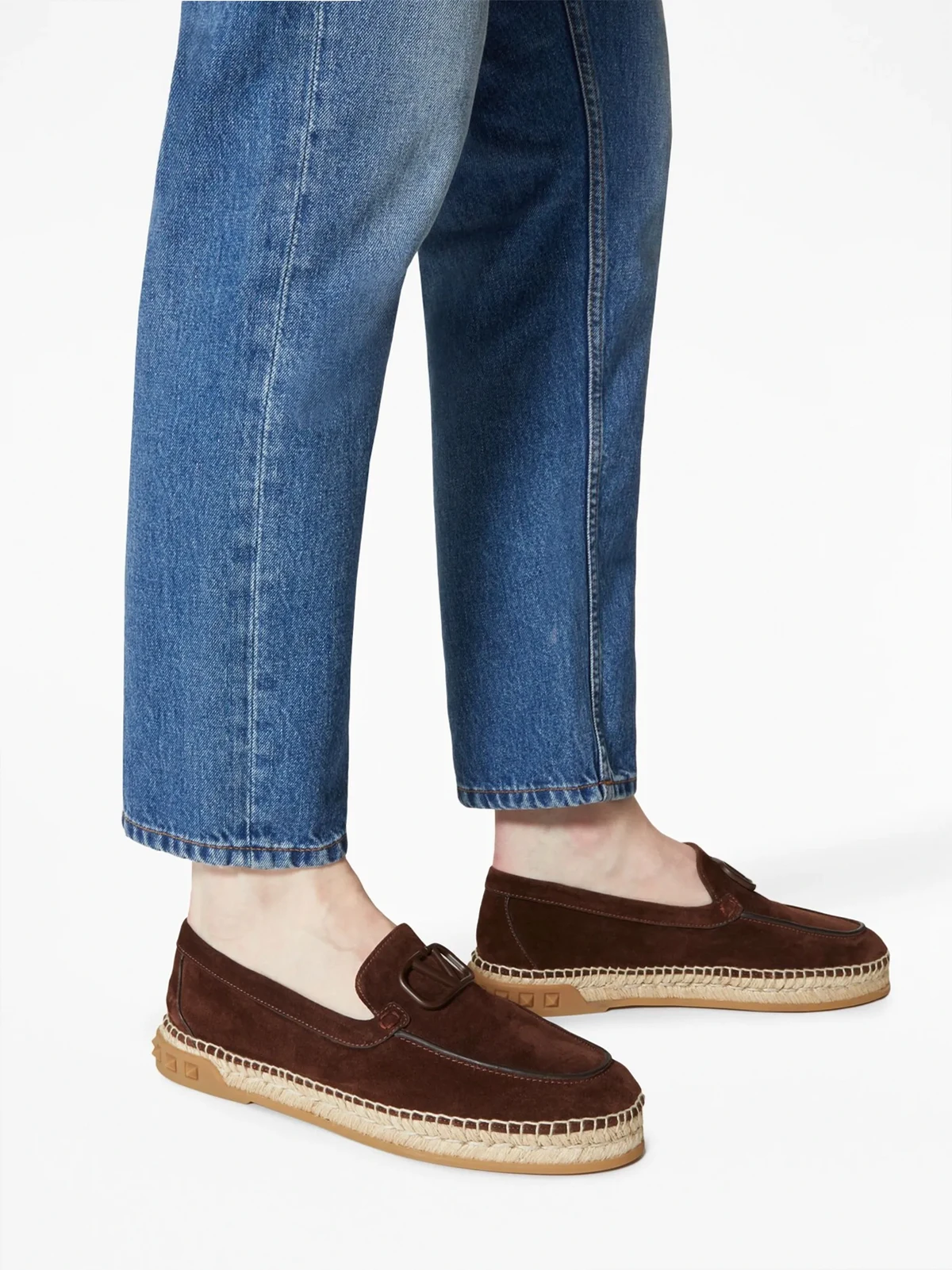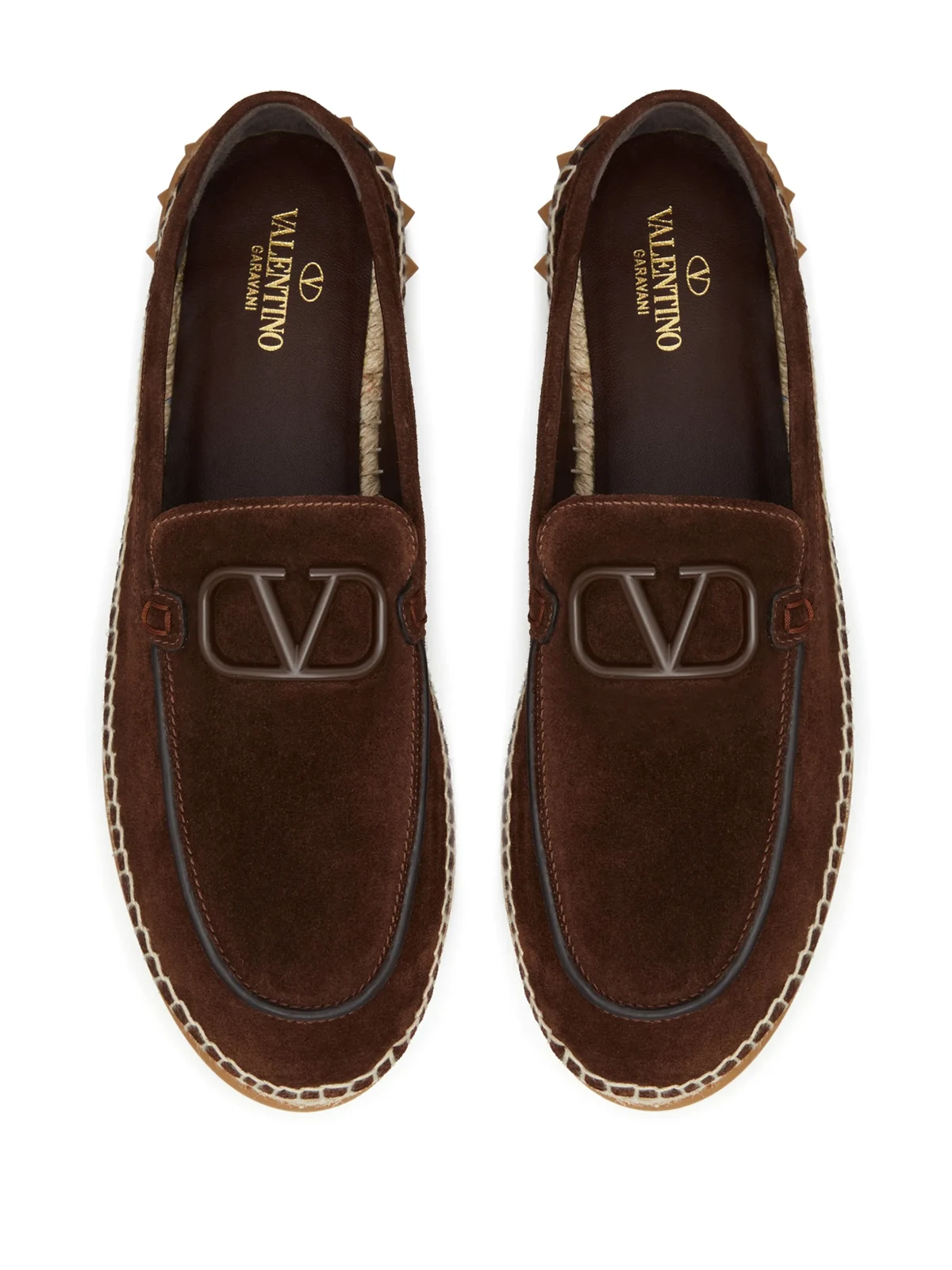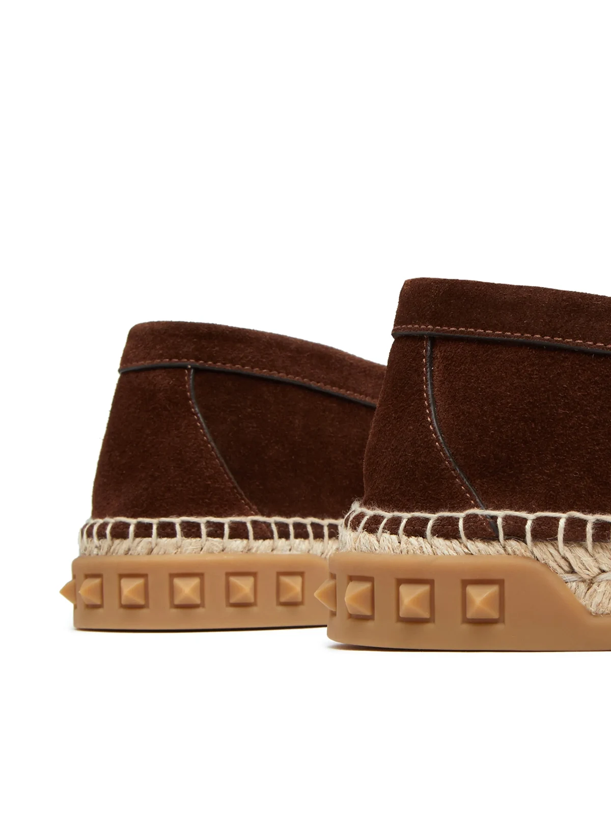 Schokobraun, Lammleder, VLogo-Detail, mandelförmige Kappe, Logo-Prägung im Fußbett, geflochtene Bastsohle.