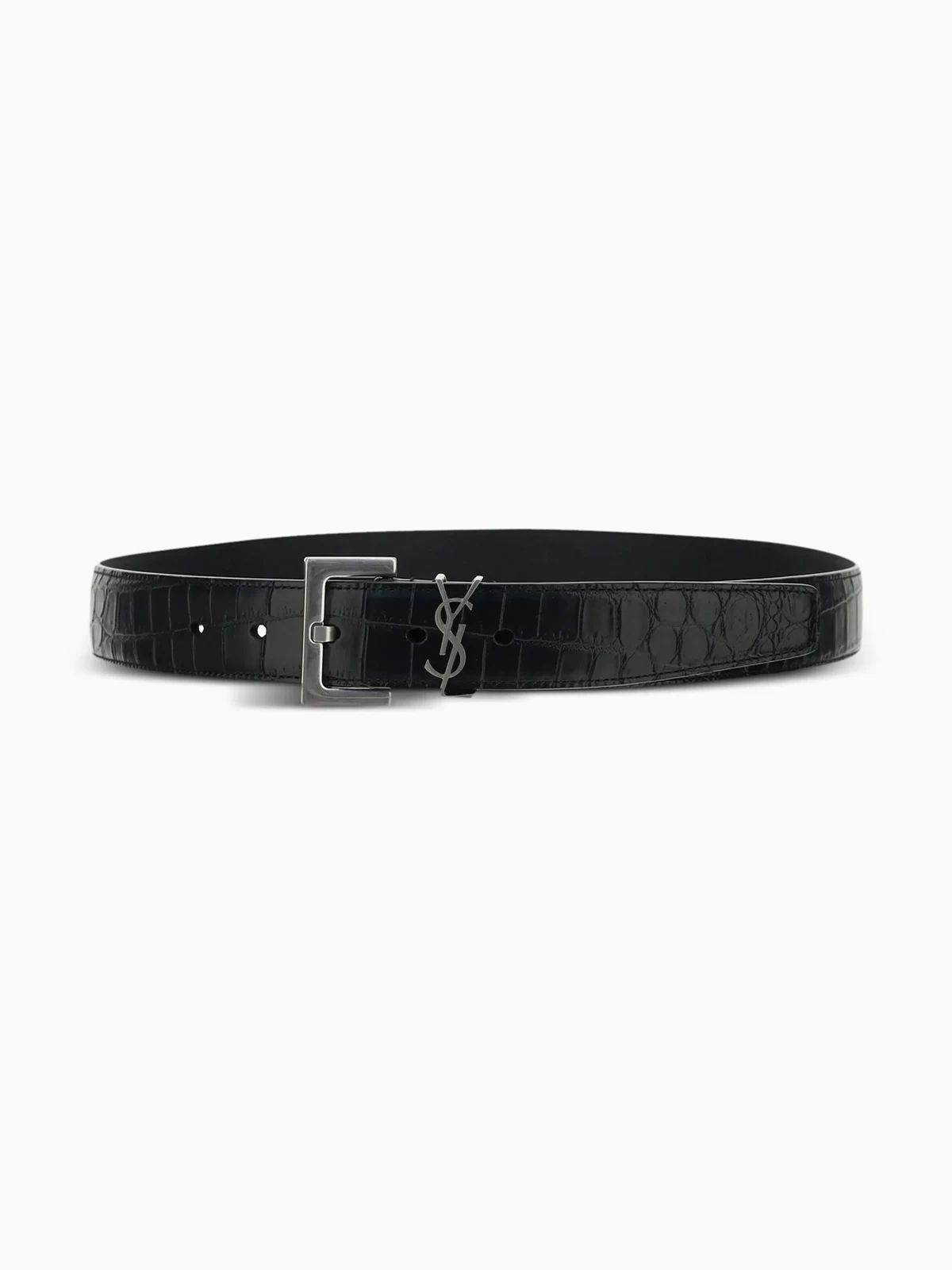 Gürtel mit Kroko-Prägung aus Leder von Saint Laurent. Merkmale: gelöchert, variable Passform und silberfarbene Beschläge.