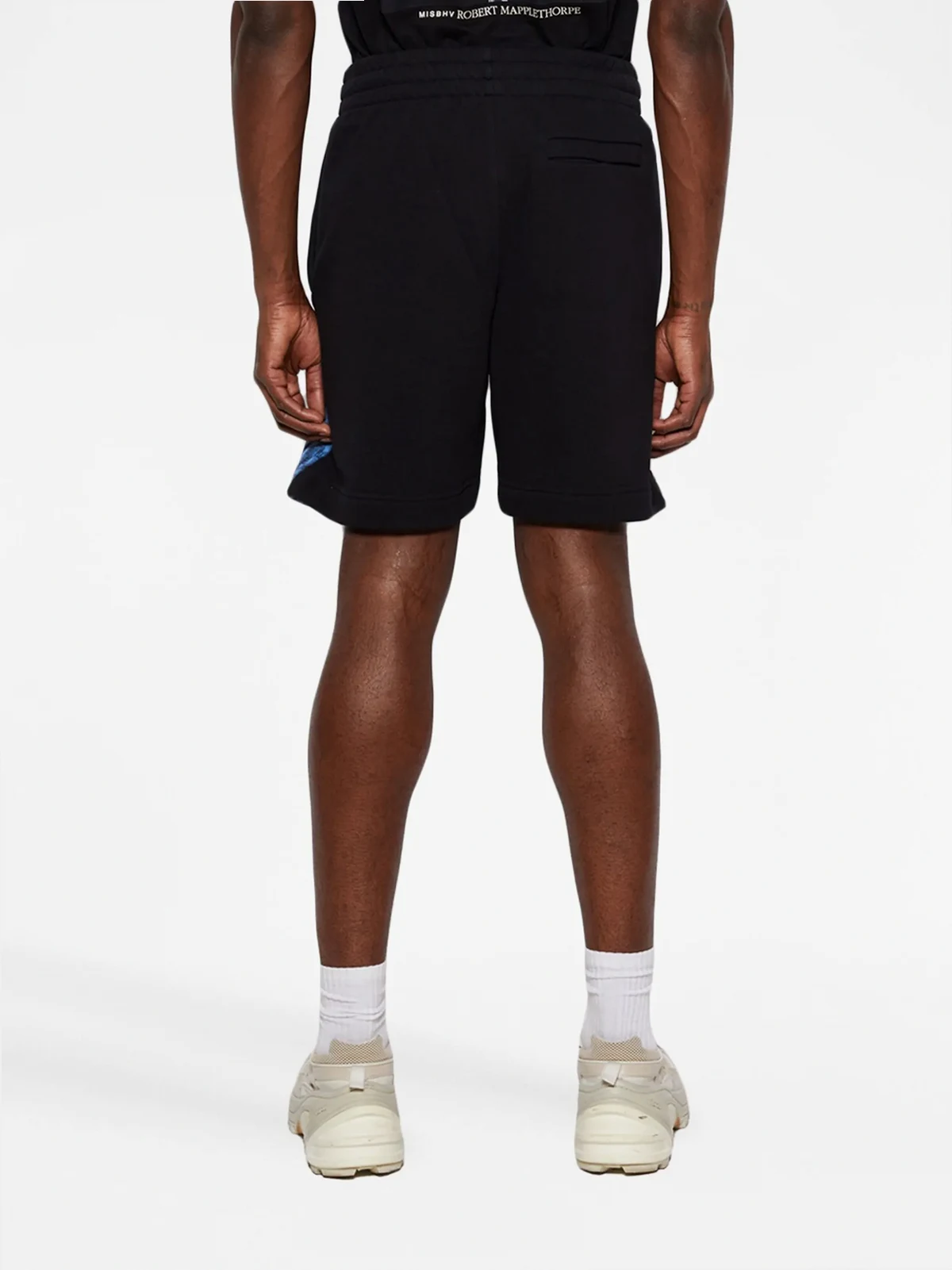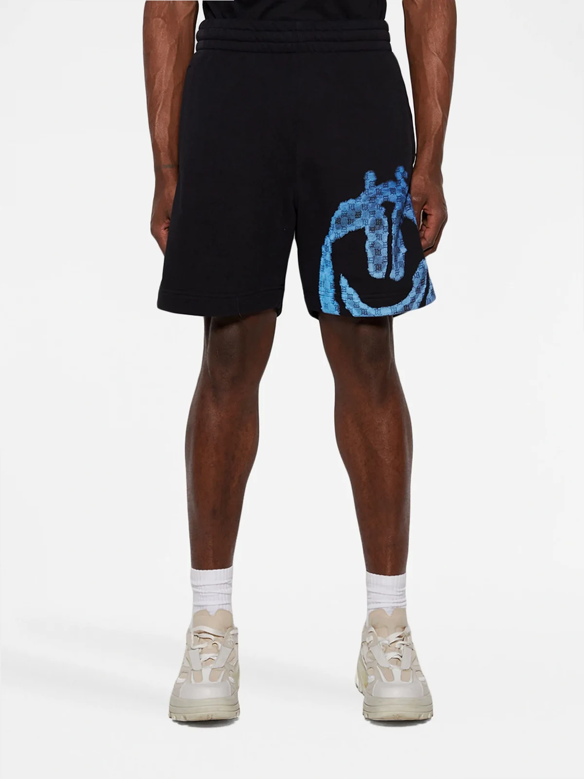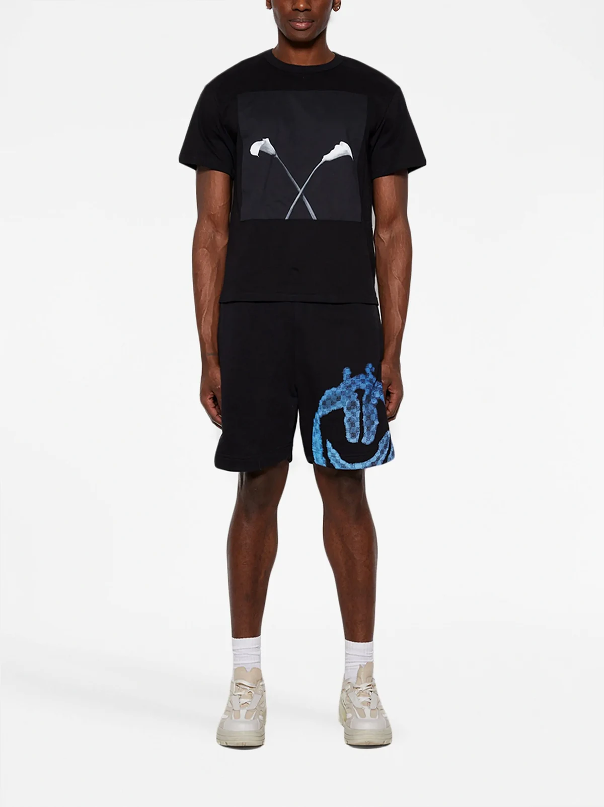 Schwarz/Blau, Baumwolle, Smiley-Print, elastischer Bund, seitliche Eingrifftaschen, eingefasste Gesäßtasche, gerades Bein.