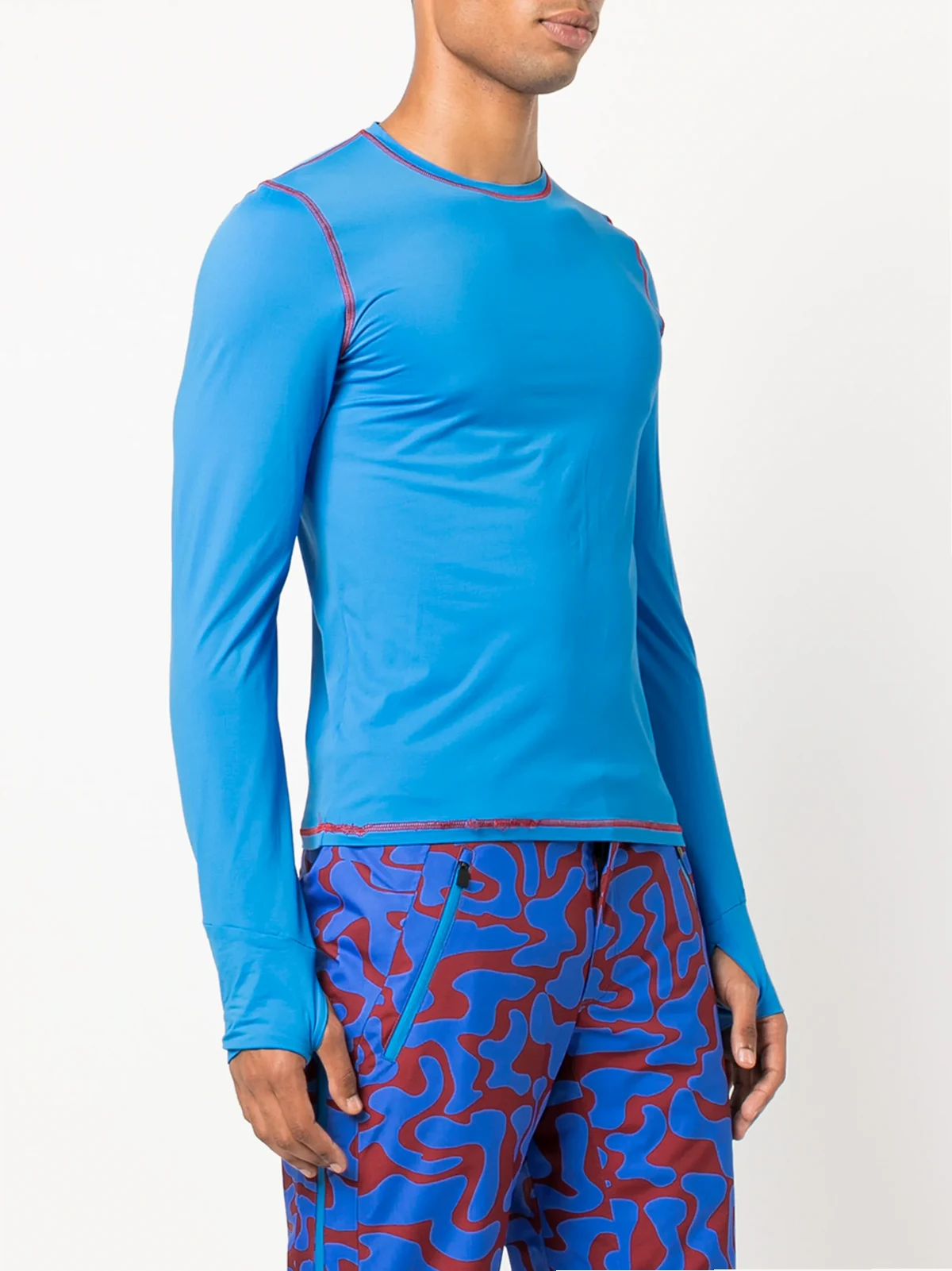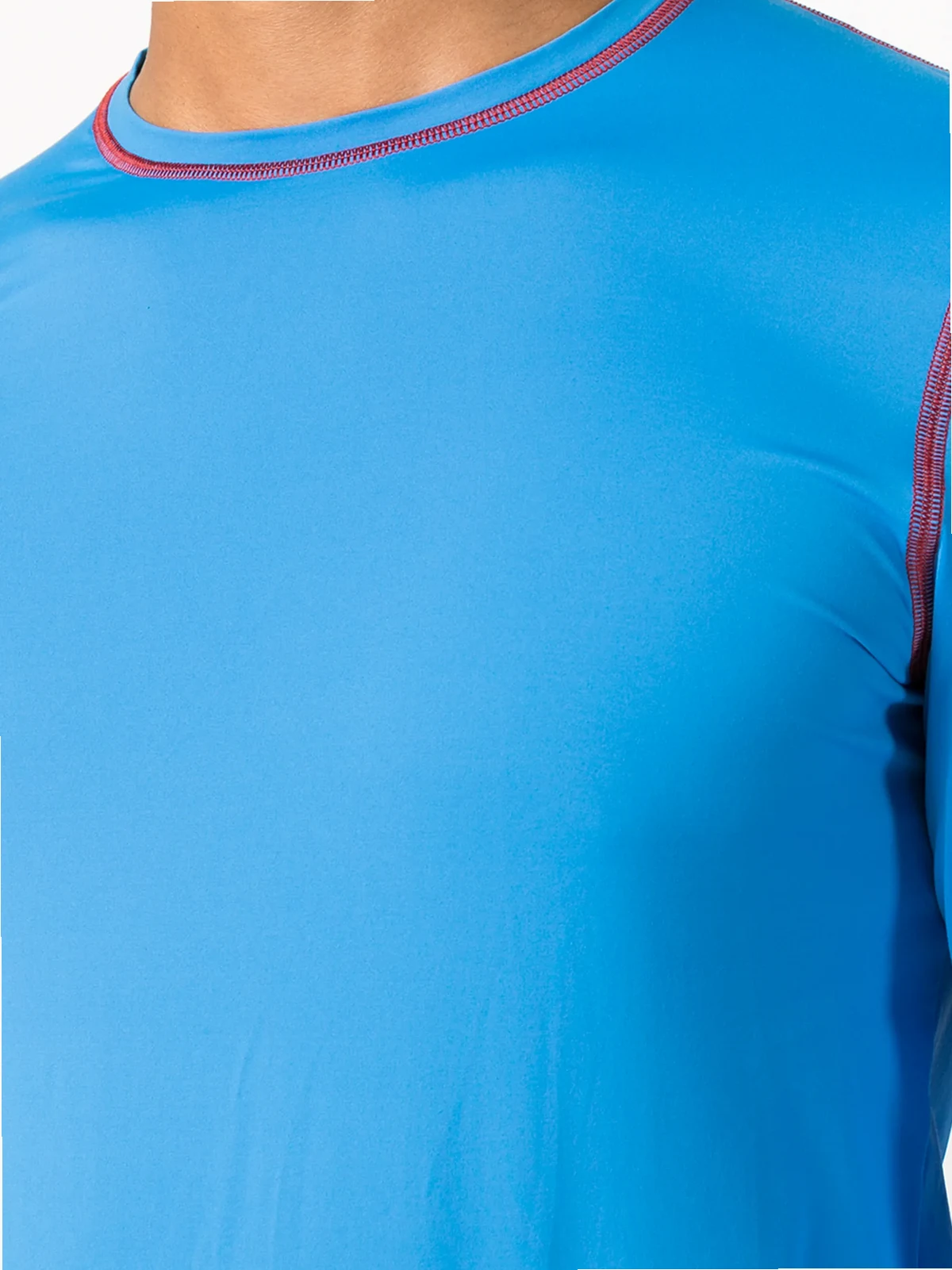 Aquablau, Kontrastnähte, runder Ausschnitt, lange Ärmel, gerader Saum.