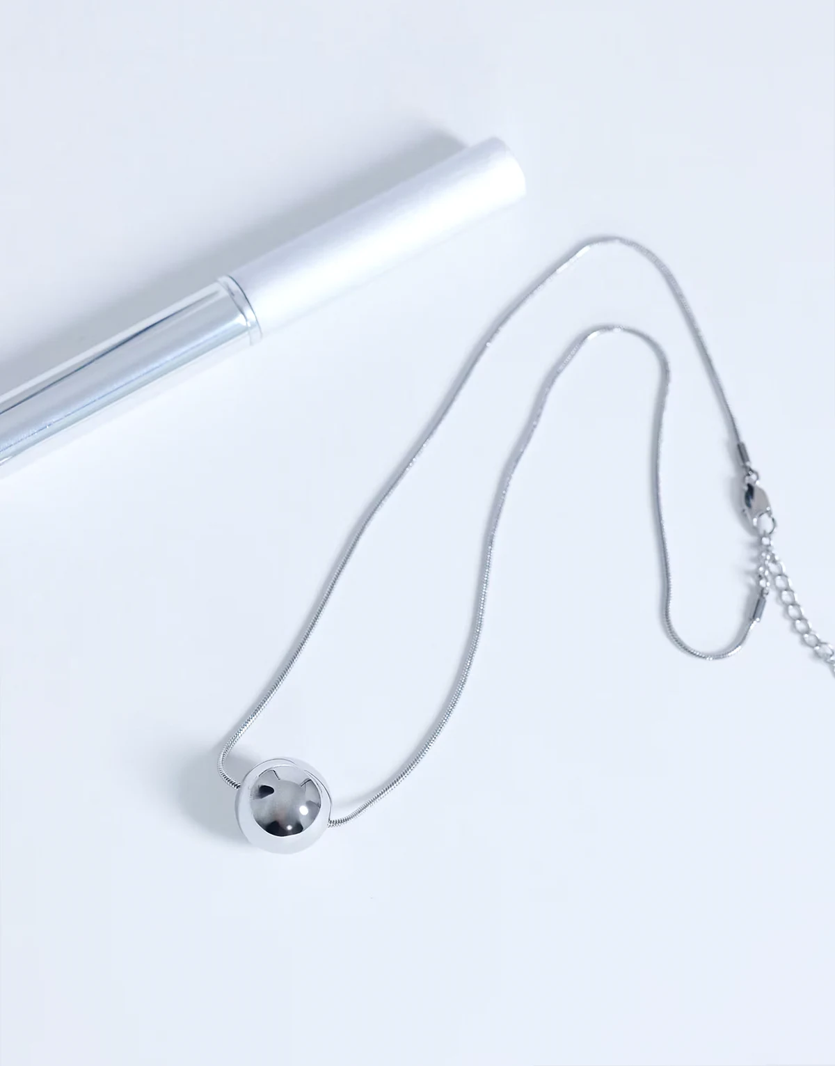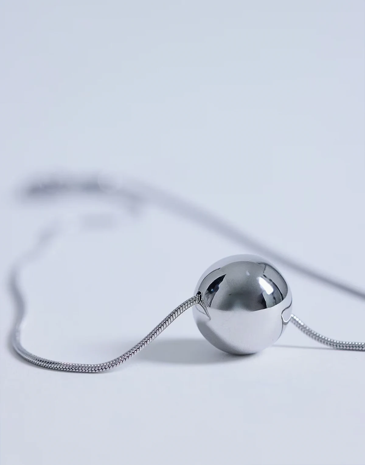 Die Halskette Dolly besteht aus einer feinen Kette mit Kugelanhänger. Sie lässt sich mit einem Karabinerverschluss und einer Verlängerungskette schließen. Mit anderen Produkten präsentiert. Jeder Artikel ist separat erhältlich.