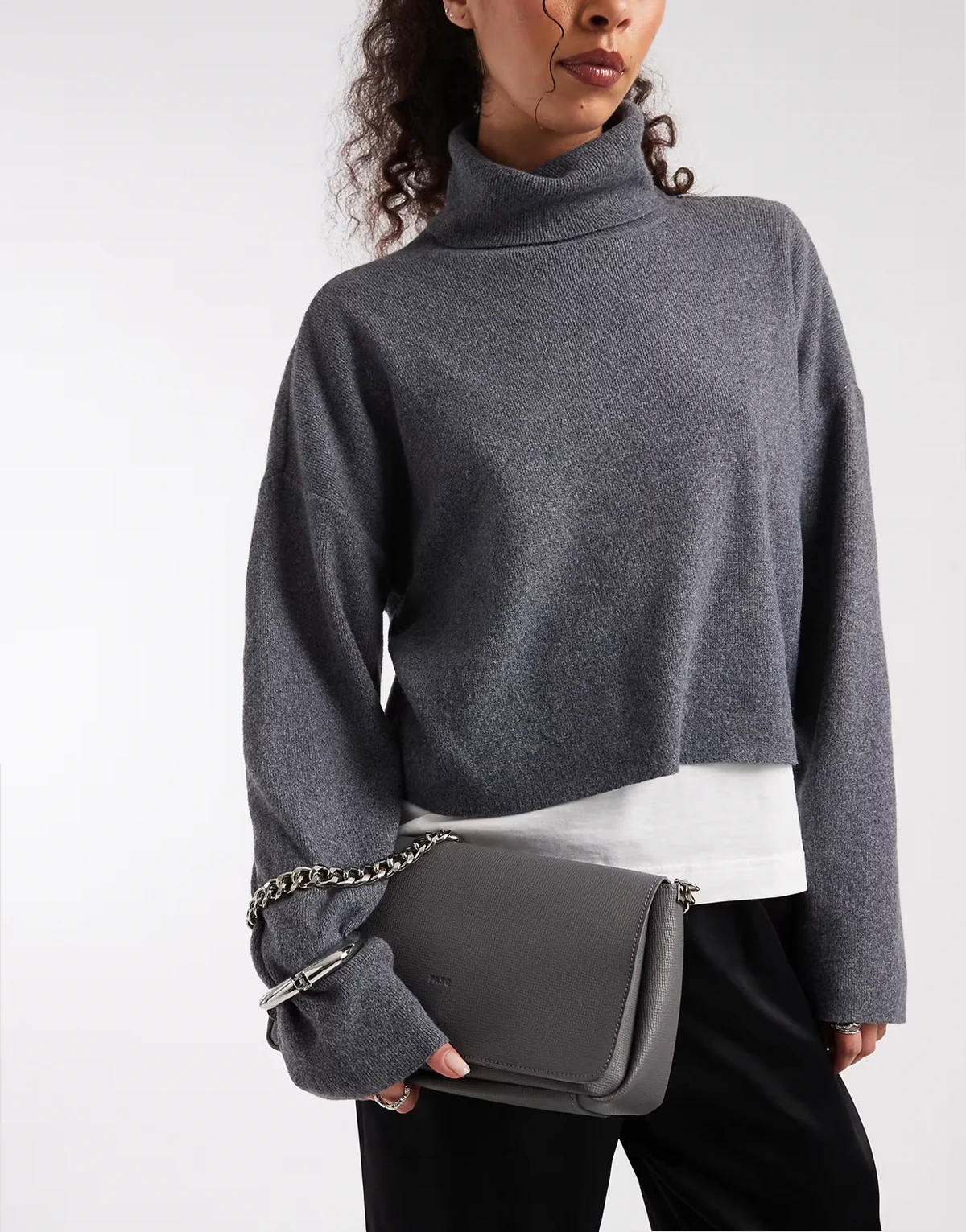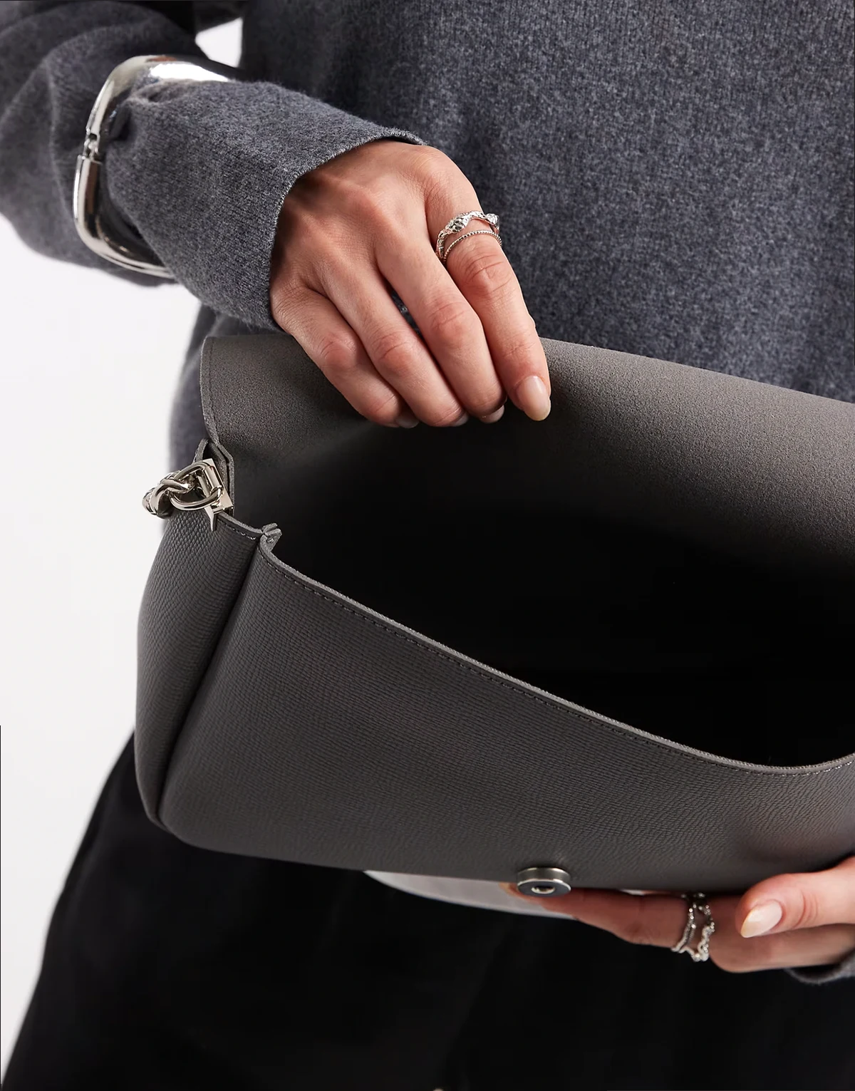 – Umhängetasche in Grau mit genarbter Umschlagklappe und Tragekette