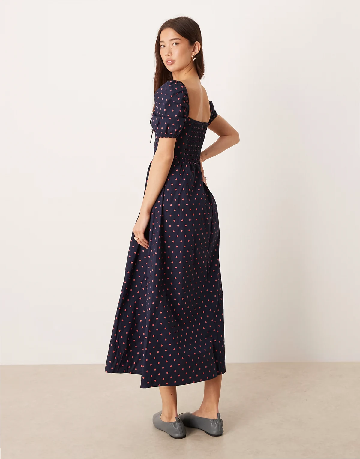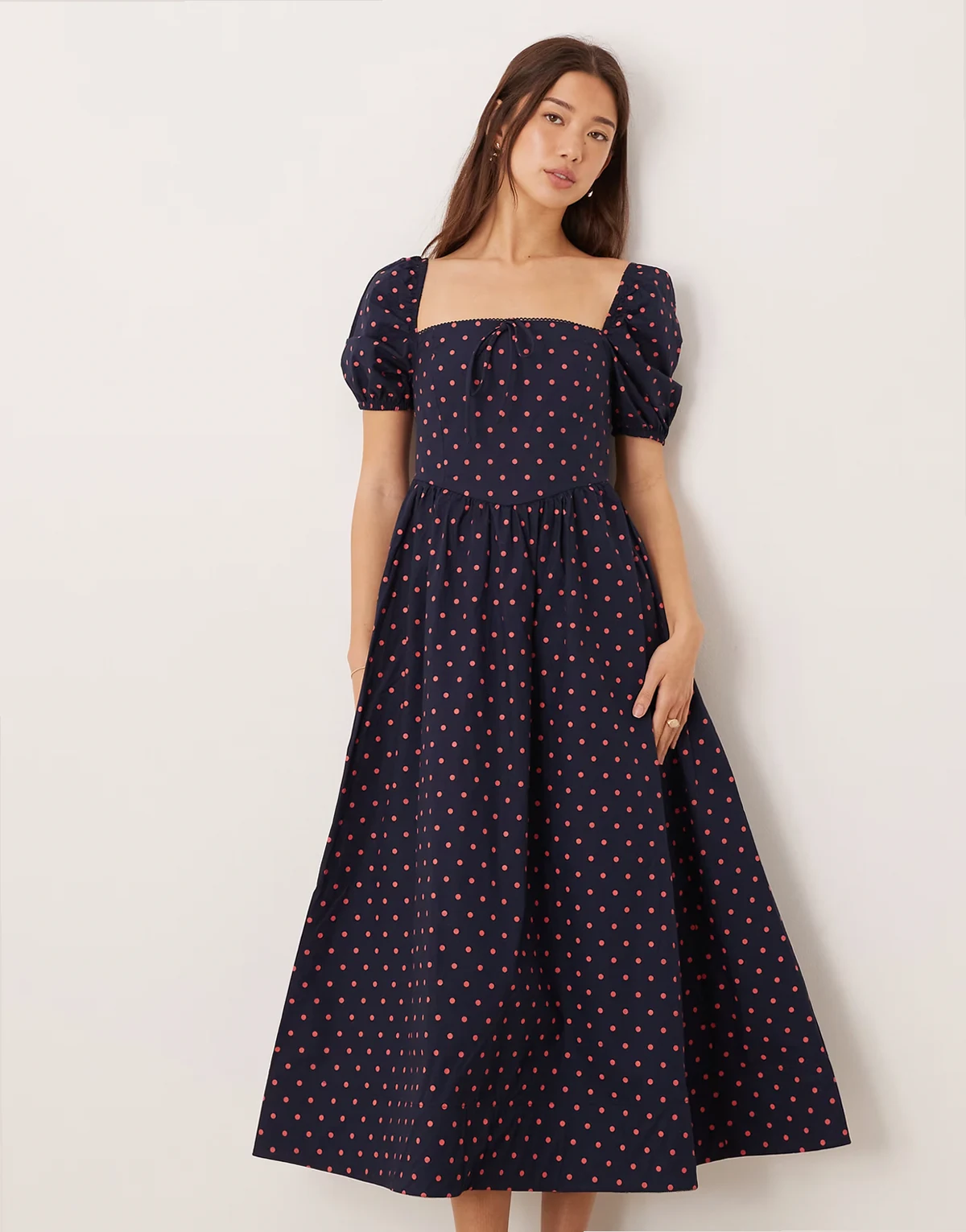 – Midaxikleid in Marineblau mit eckigem Ausschnitt, Puffärmeln und rosa Polka Dots