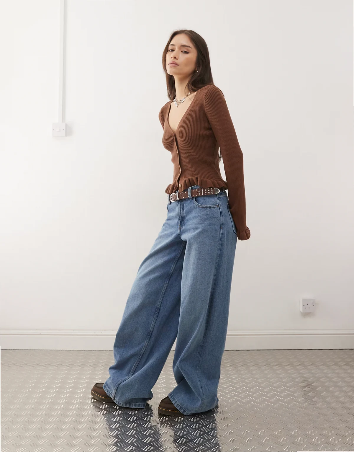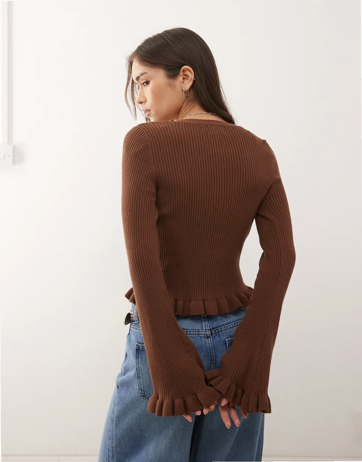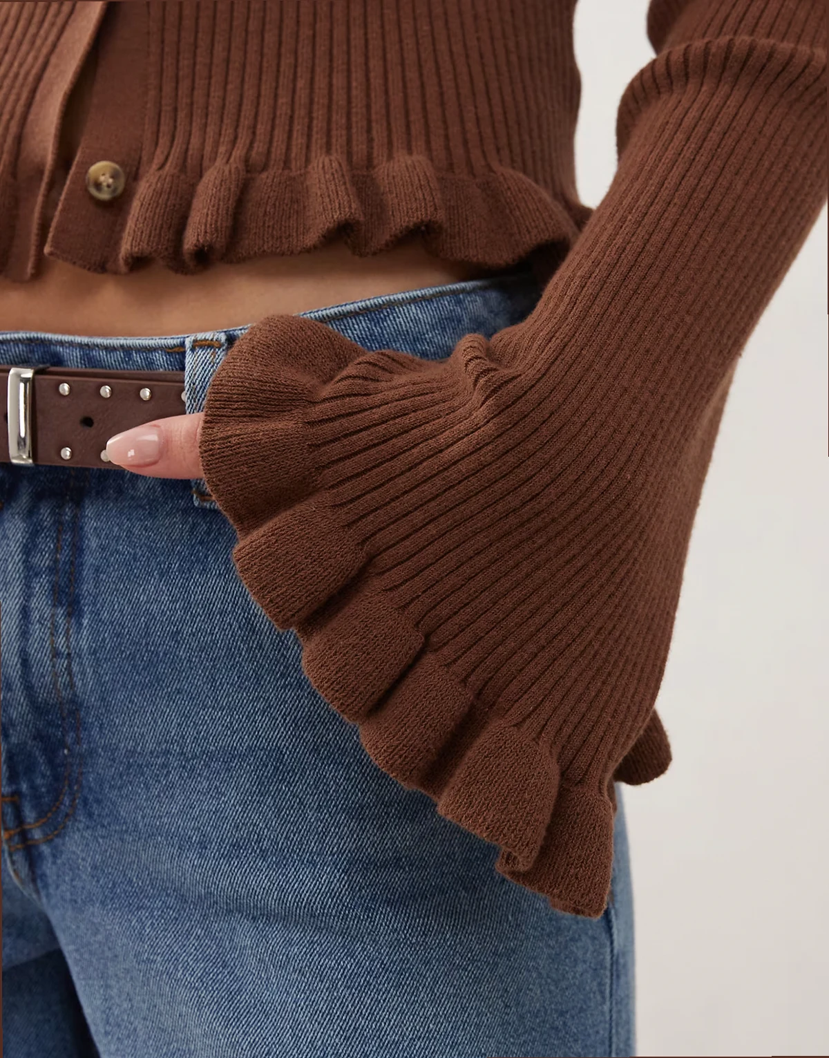 – Strickjacke in Schokobraun mit ausgestellten Rüschenärmeln
