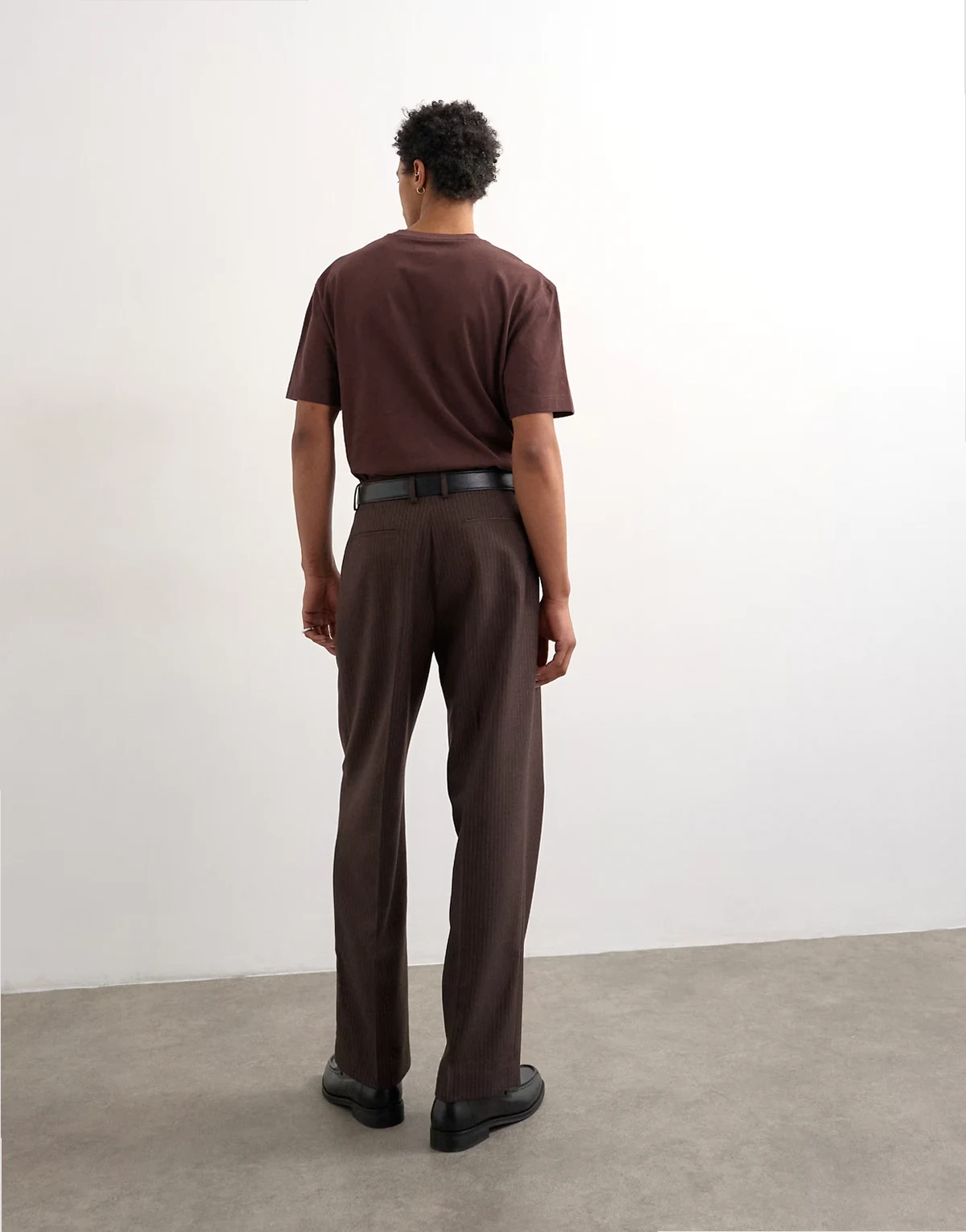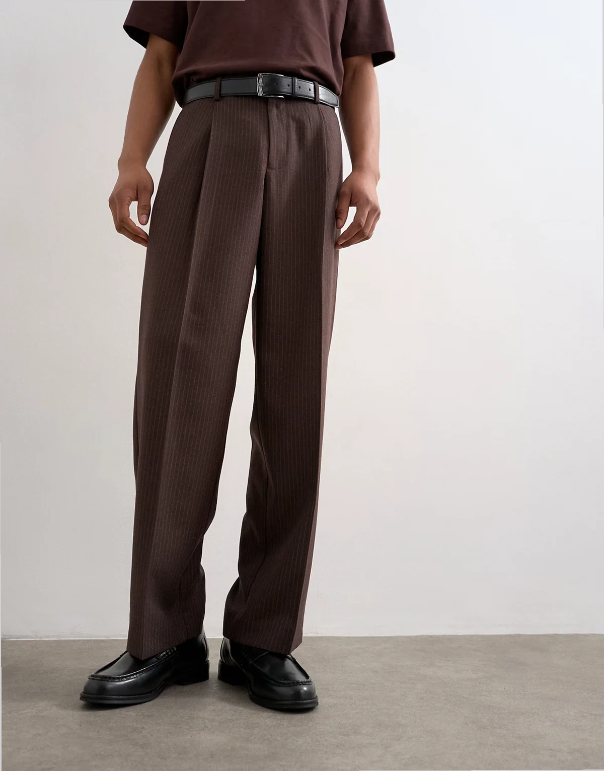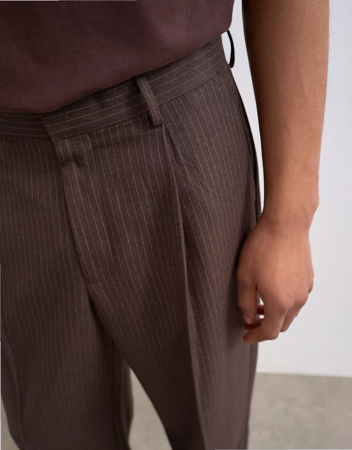 Diese Hose ist aus einem Gewebe mit Nadelstreifen-Design gefertigt. Sie verfügt über Gürtelschlaufen, eine reguläre Bundhöhe, Bundfalten und funktionale Taschen. Dieses Modell weitem Beinschnitt vereint Komfort mit Raffinesse.
