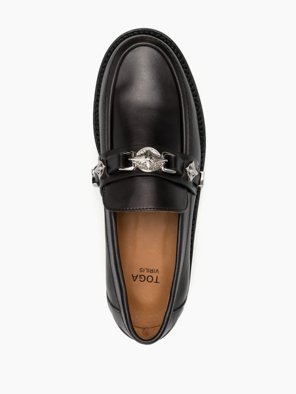 Zedernbraun, Leder, silberfarbene Beschläge mit Logo-Gravur, runde Kappe, ohne Verschluss, Logo-Prägung im Fußbett, flache Ledersohle.