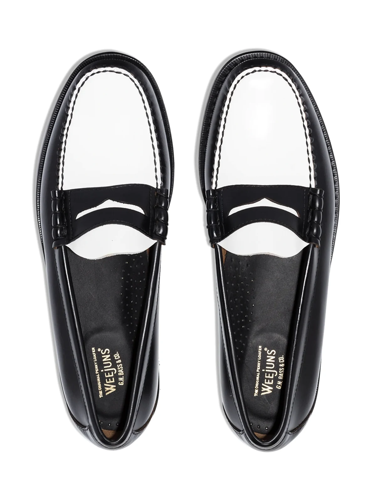 Zweifarbig, Penny-Riemen, Logo-Prägung im Fußbett, runde Kappe, ohne Verschluss, flache Ledersohle. Material: Leder.