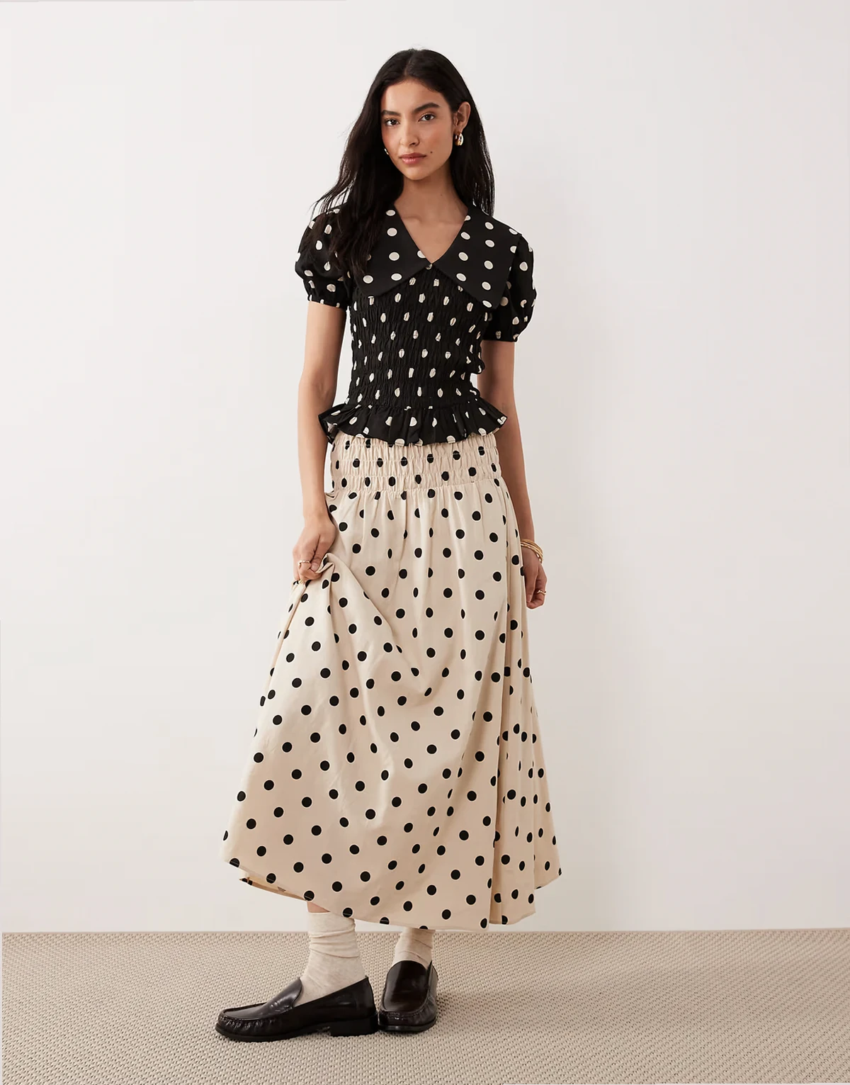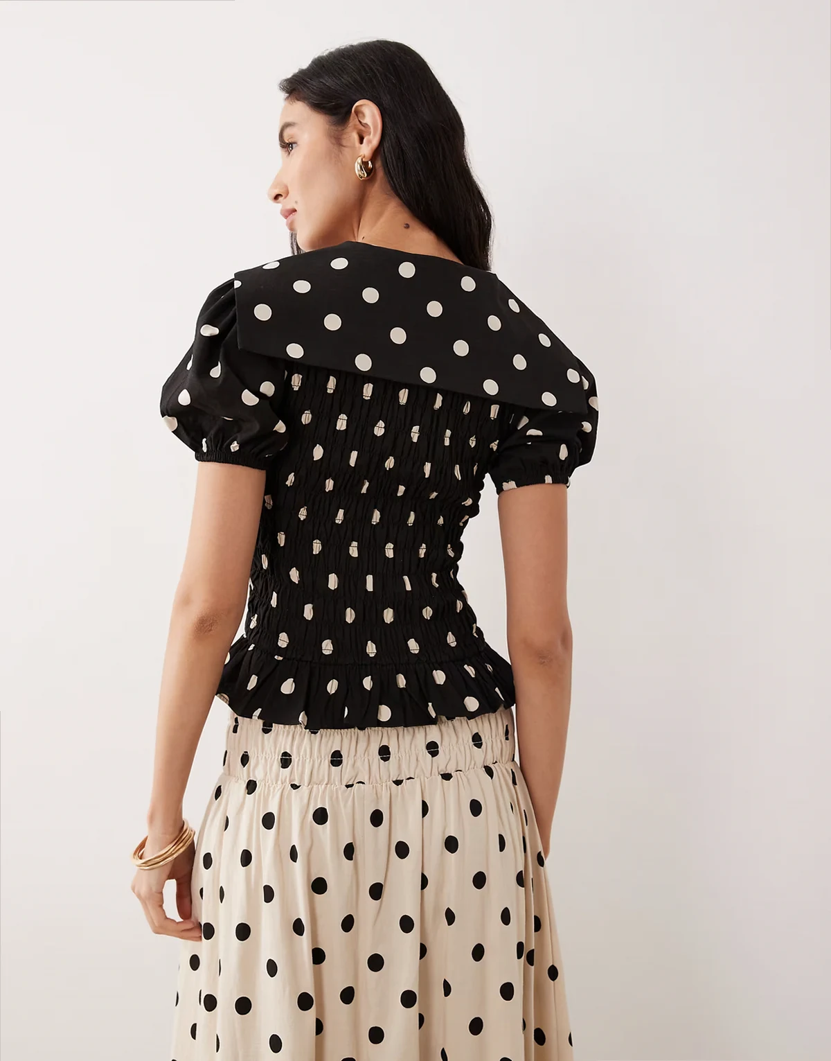 – Gesmoktes Oberteil in Schwarz mit Puffärmeln, Kragen und Polka Dots, Kombiteil