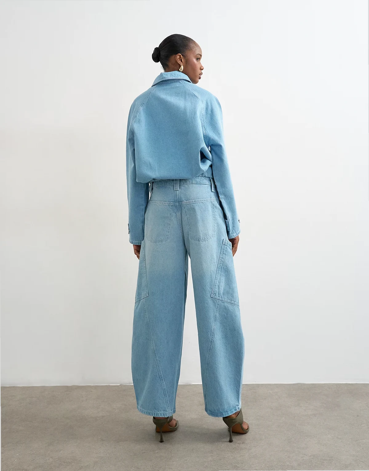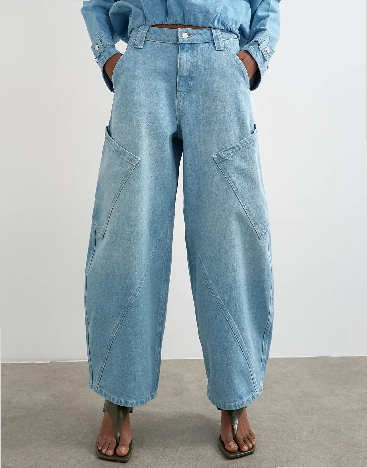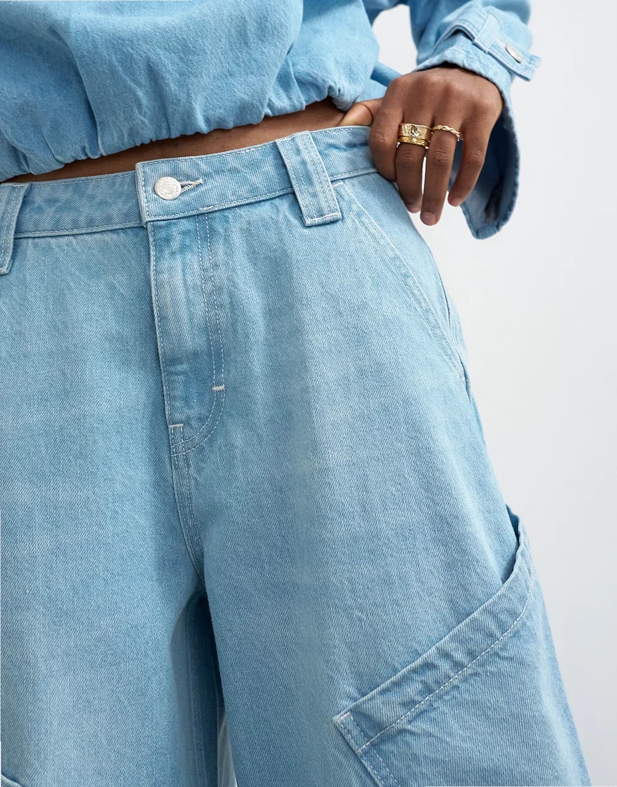 Diese Jeans hat einen abgerundeten Beinschnitt, der am Knöchel schmal zuläuft. Das Modell verfügt über einen hohen Bund, Gürtelschlaufen, funktionale Utility-Taschen und Nahtdetails. Die Jeans ist aus Denim ohne Stretchanteil in blauer Bleach-Waschung gefertigt.