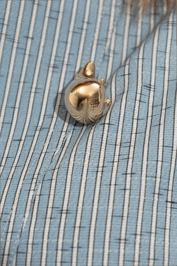 Die Brosche hat eine organische, stromlinienförmige Form, die einem Tropfen ähnelt und Eleganz sowie Subtilität ausstrahlt. Die glatte und glänzende Oberfläche betont ihr modernes, minimalistisches Design und macht sie zu einem idealen Accessoire für exklusive Outfits. Der klassische Verschluss auf der Rückseite sorgt für einfache Handhabung und sicheren Halt.