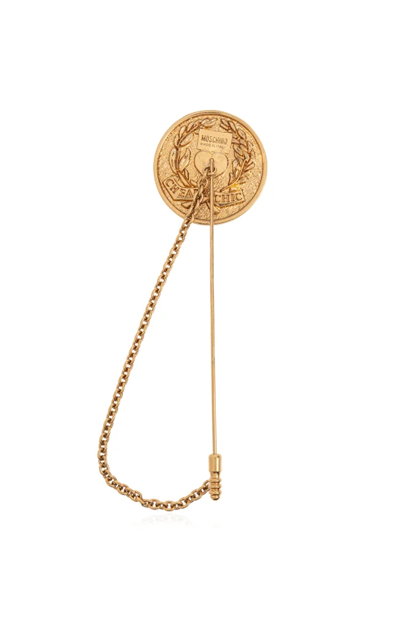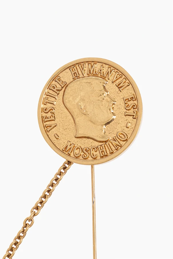 Die Brosche in Münzform von Moschino ist die Essenz zeitloser Eleganz und raffinierten Stils. Die Inspiration durch eine Münze verbindet sich hier mit markanten künstlerischen Akzenten – das erhabene Kopfprofil auf der Vorderseite, gekrönt durch die Inschrift „VESTIRE HUMANUM EST” sowie die prägnante Markensignatur „MOSCHINO”, glänzen durch die edle Formgebung.