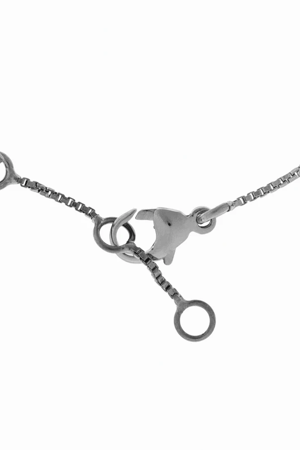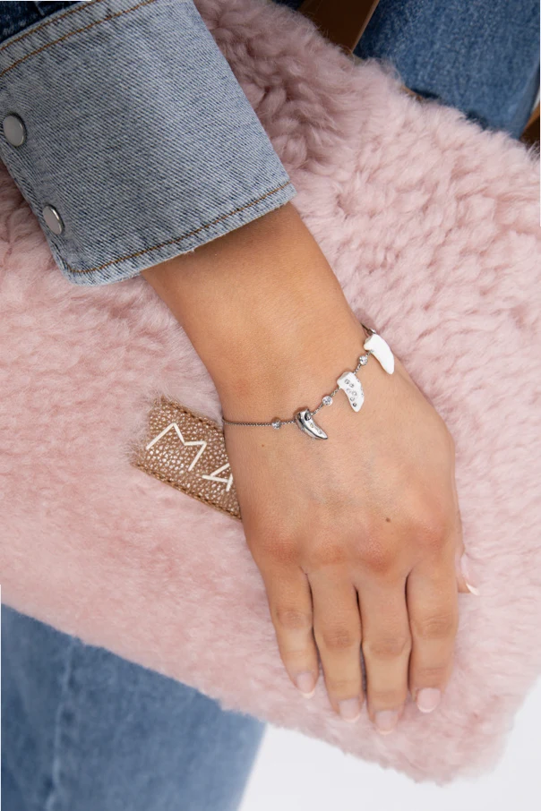 Die Oberfläche des Armbands wurde sorgfältig mit einem edlen, silbrigen Glanz versehen, der durch eine spezielle Beschichtung aus Messing erzielt wird. Für einen effektvollen Schimmer sorgen feine, funkelnde Kristalle, die harmonisch zwischen den Anhängern platziert wurden und so eine Komposition schaffen, die sowohl Blicke als auch Licht auf sich zieht.