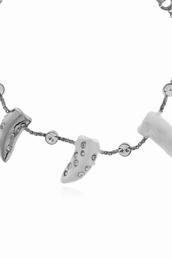 Messingarmband der Marke Marni ist ein raffiniertes Beispiel zeitgenössischer Eleganz, das Klassik und die subtile Schönheit der Natur perfekt verbindet. Die zarte, runde Form betont die Schlankheit des Handgelenks, während die einzigartigen, unregelmäßigen Anhänger – inspiriert von organischen Formen wie Gesteinsfragmenten oder Zähnen – einen unverwechselbaren, künstlerischen Akzent setzen.