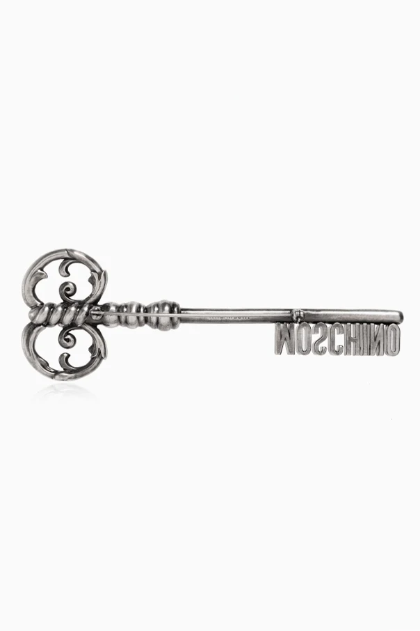 Durchbrochene, dekorative Verzierungen krönen den Kopf der Brosche und verleihen dem Ganzen Leichtigkeit und feinen, schmuckhaften Charakter. Der Stiel ist mit einem dreidimensionalen, markanten Schriftzug MOSCHINO versehen, der den Prestige und die Einzigartigkeit des Designs unterstreicht. Die dezente, standardmäßige Befestigungsmechanik sorgt für hohen Tragekomfort.