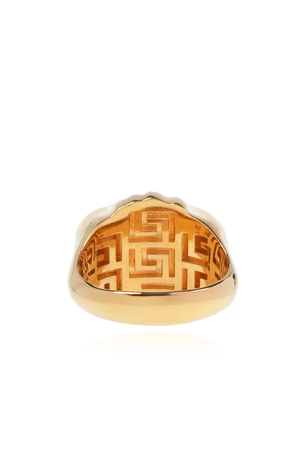 Gold-tone ring from Versace. Made of metal, it showcases a motif of Medusa and an internally engraved logo.