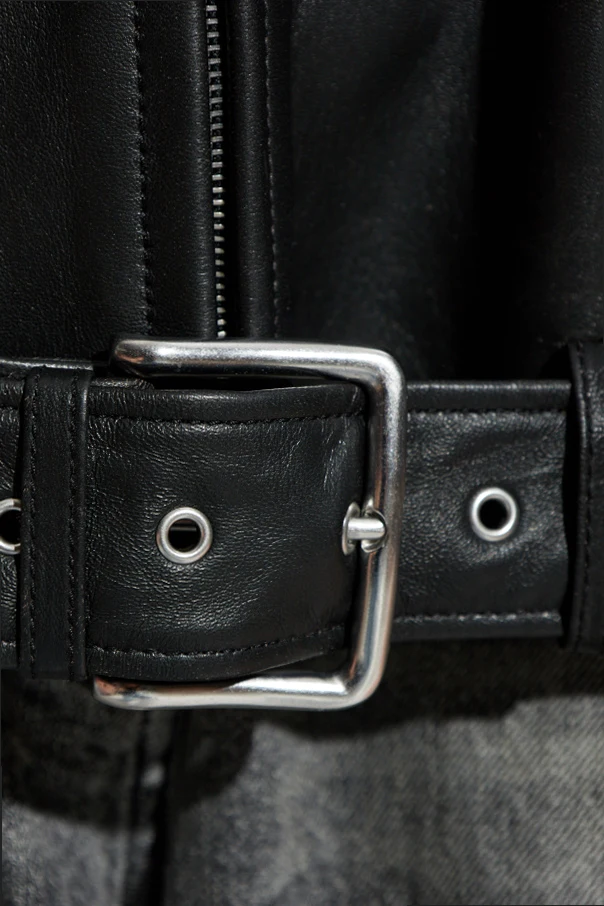 Die Jacke ist mit einem zentralen Metallreißverschluss sowie einem breiten Ledergürtel mit auffälliger Schnalle ausgestattet, die sowohl ästhetisch als auch praktisch ein markantes Detail darstellen. Zwei dezente, schräge Taschen und das subtile Logo auf dem Rücken zeugen von Liebe zum Detail und hoher Handwerkskunst.