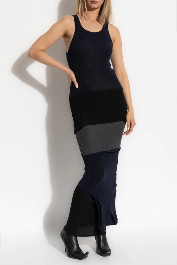 Geripptes, figurbetontes Kleid von Balenciaga ist die Verkörperung moderner Eleganz und raffinierter Schneiderkunst. Die schlanke Maxilänge betont die Silhouette auf elegante Weise, während der weiche, elastische Strick mit ausgeprägten Rippen durch seine Struktur und subtile Haptik begeistert. Die Komposition aus horizontalen Segmenten in tiefen Schwarz-, Graphit- und Dunkelblautönen verleiht der Farbharmonie eine edle Ausstrahlung.