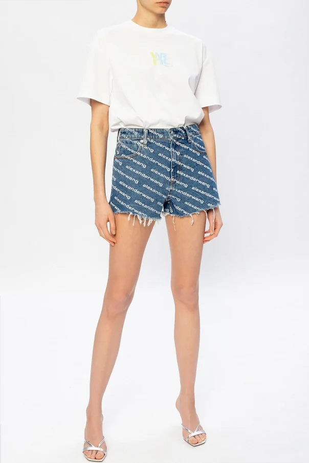 Blue denim shorts from Alexander Wang. Fastened with a button and zip fly, this design features a white logo print, three front pockets, two back pockets and raw trims.