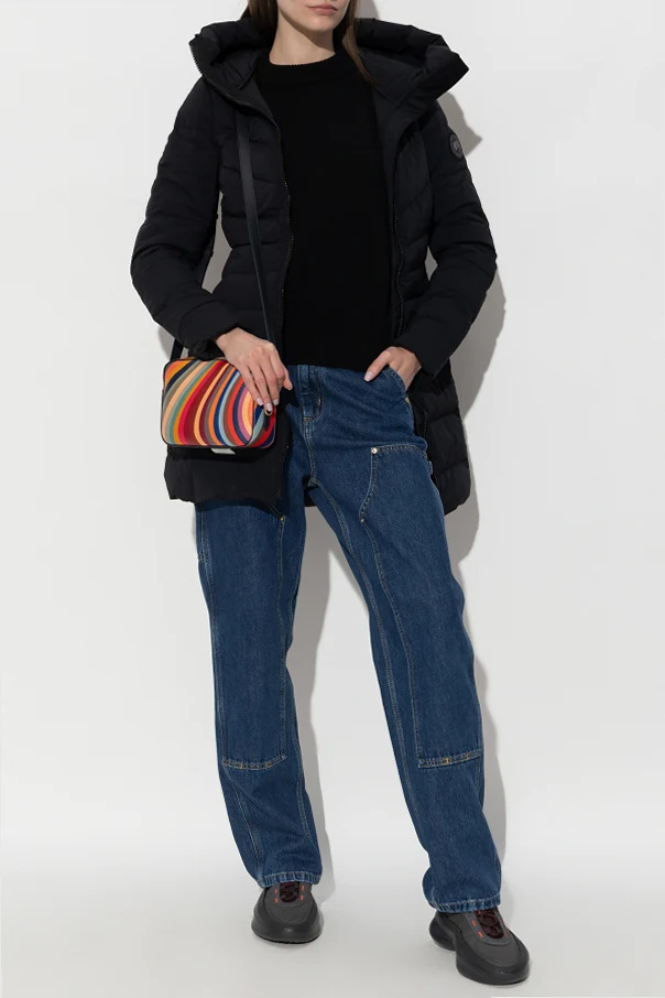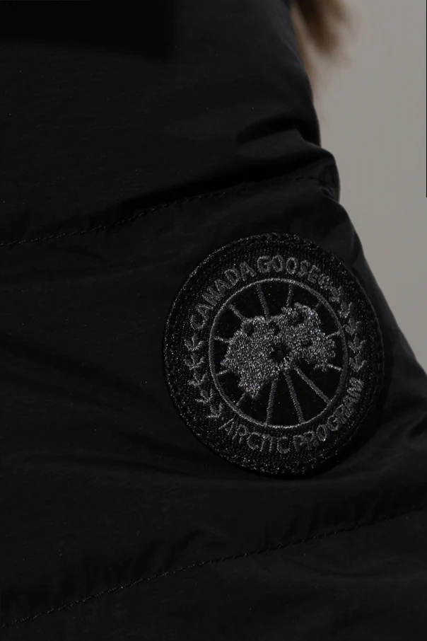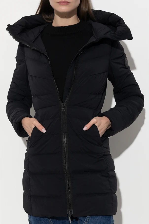 Black ‘Clair’ down jacket from Canada Goose. Fastened with a two-way zip, this garment features a logo patch, two zip pockets, drawstring hood and long sleeves.