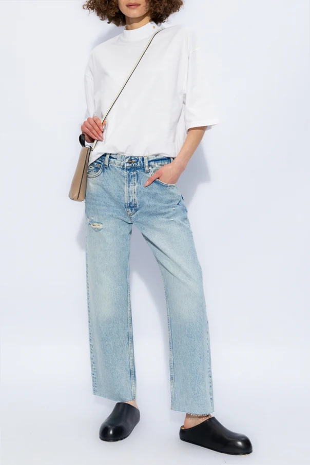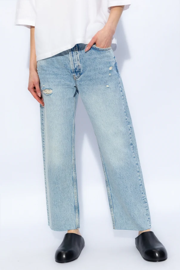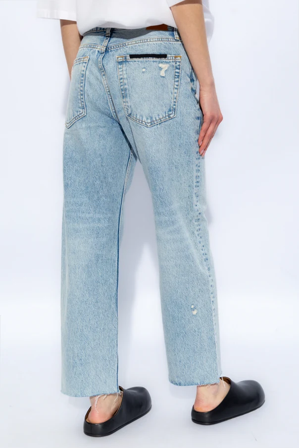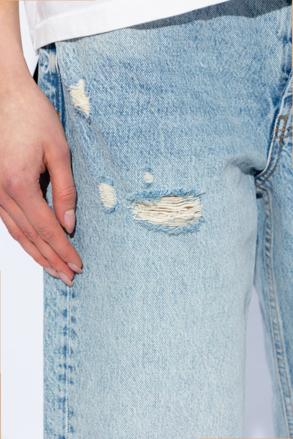 Light blue ‘Gavin’ jeans with a relaxed straight fit from Anine Bing. Enriched by a washed and distressed effect, this pair features buttons, a brown logo-embossed patch at the back and five slip pockets.