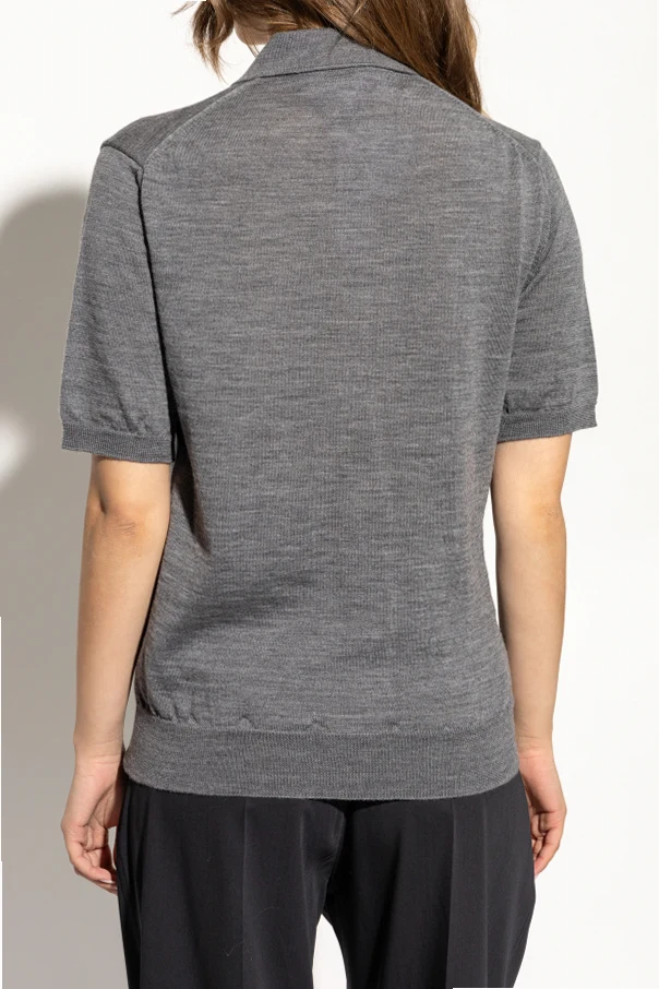 Wir präsentieren das Wollpolo der exklusiven Marke Comme des Garçons Play , das die Quintessenz von Eleganz und zeitlosem Stil verkörpert. Dieses klassische Poloshirt mit kurzen Ärmeln, das mit zwei Knöpfen am Kragen geschlossen wird, besteht aus hochwertigster Wolle und verleiht ihm ein luxuriöses Aussehen.
