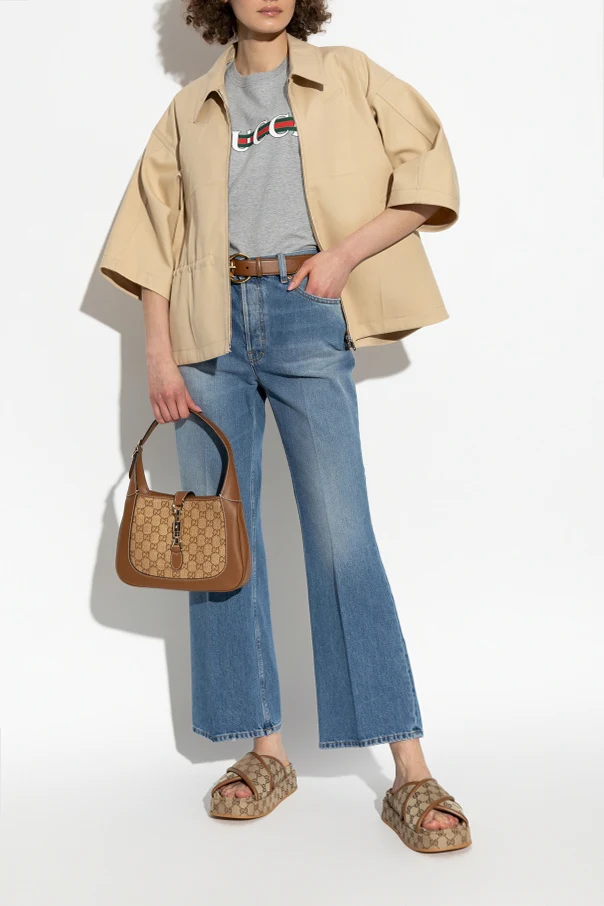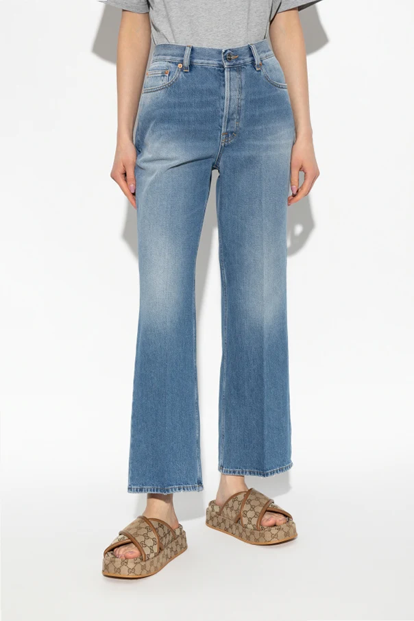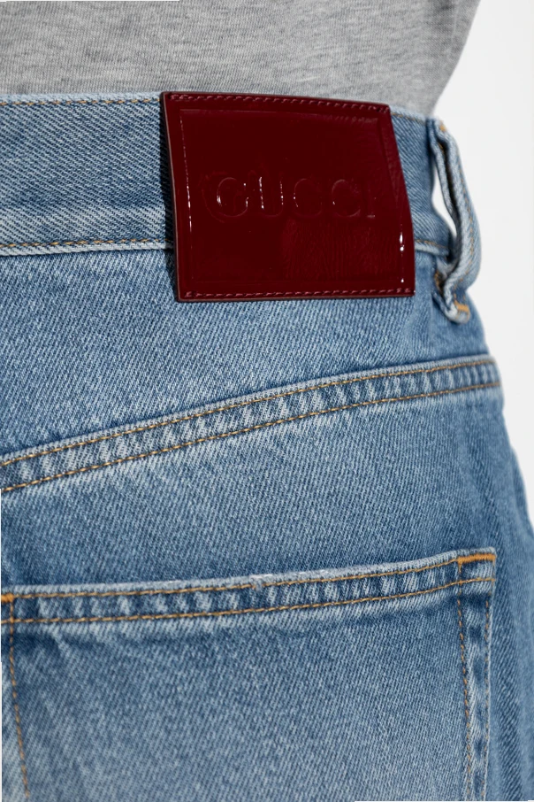 Ein praktischer Verschluss mit klassischem Reißverschluss und Knopf ergänzt das Set standardmäßiger Taschen, die Funktionalität und Komfort bieten. Die hinteren Taschen sind in einem minimalistischen Stil gehalten, der die Eleganz des Designs unterstreicht. Ein dunkelrotes Label mit geprägtem Gucci-Logo am Bund ist das Erkennungsmerkmal der Exklusivität dieser Marke.