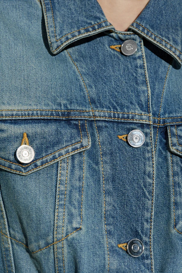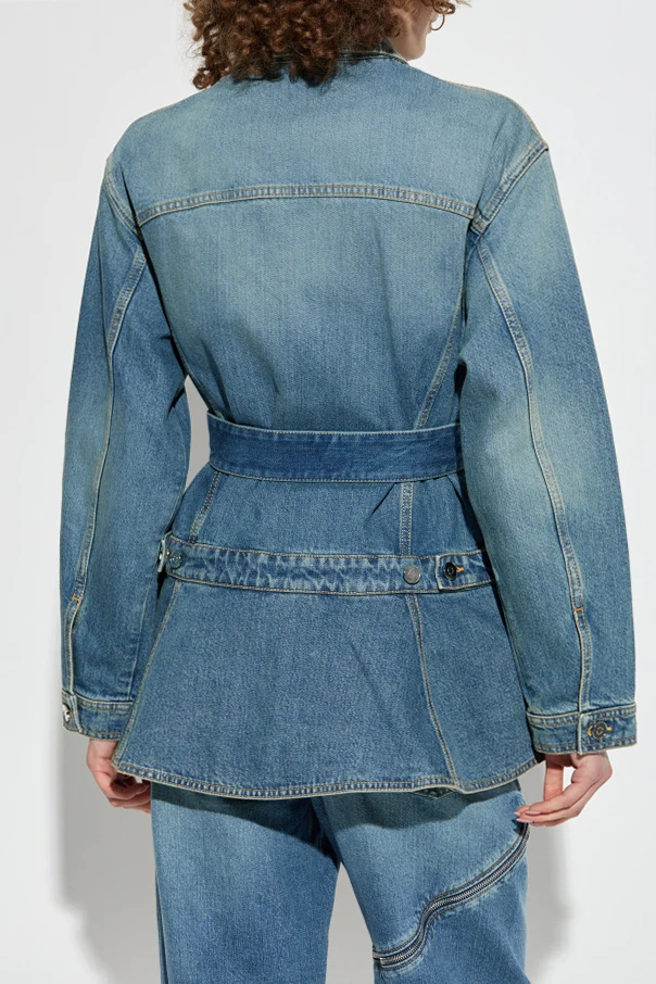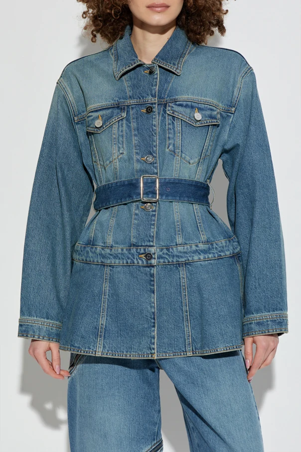 Wir präsentieren die Jeansjacke mit Gürtel aus der exklusiven Kollektion von Alaïa , die klassisches Design mit Modernität spektakulär vereint. Aus blauem Denim gefertigt, strahlt sie zeitlosen Stil aus. Der leicht ausgestellte Saum und der die Taille betonende Gürtel verleihen der Silhouette feminine Eleganz.