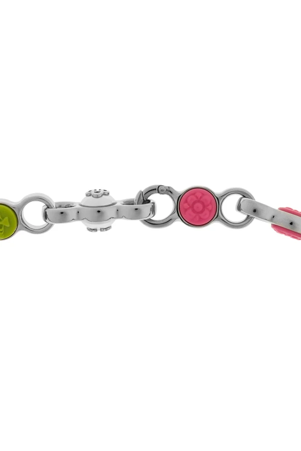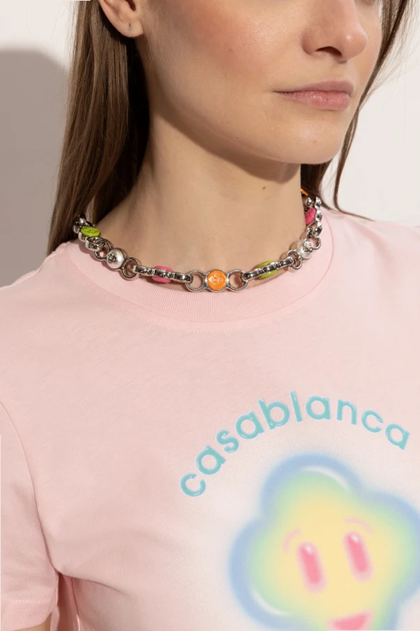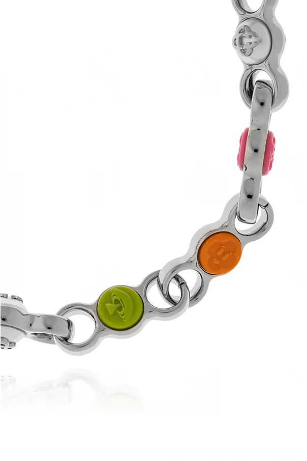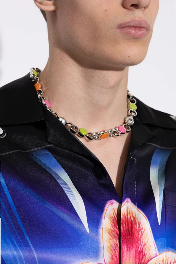 Choker mit Perle von Casablanca ist eine raffinierte Halskette, die zeitlose Klassik mit modernem Ausdruck vereint. Die Silhouette des eng anliegenden Chokers präsentiert sich harmonisch, gefertigt aus sich wiederholenden Gliedern mit einer metallisch-silbernen Fassung und farbigen, emaillierten oder harzgefüllten Einlagen in Rosé-, Grün- und Orangetönen. Das vorherrschende Multicolor verleiht dem Ganzen einen einzigartigen Charakter, während eine matte Perle und dezente Prägungen der Komposition einen Hauch von Geheimnis hinzufügen.