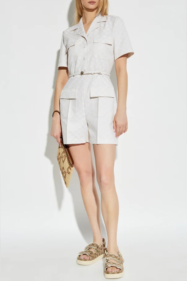 Ein stilvoller Gürtel mit metallischem GG-Logo in der Taille betont sanft die Silhouette und macht diesen Overall zur idealen Wahl für verschiedene Anlässe. Dieses edle modische Kunstwerk ist das Ergebnis der innovativen Vision von Kreativdirektor, der die Marke Gucci revolutioniert, indem er Luxus mit Modernität verbindet.