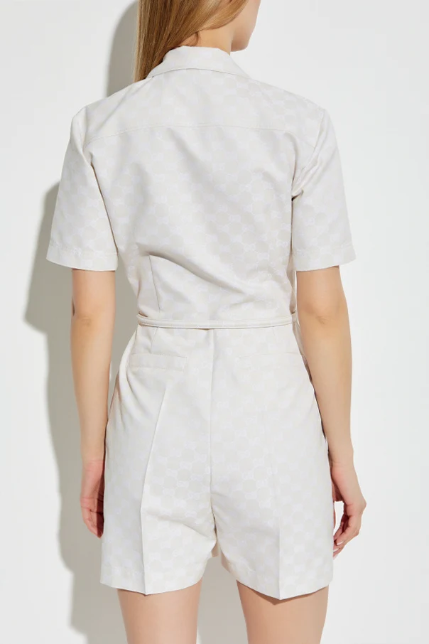 Präsentieren Sie sich in voller Eleganz mit dem Overall mit GG-Muster von der renommierten Marke Gucci . Dieses außergewöhnliche Kleidungsstück in cremefarbenem Ton mit dezentem GG-Muster ist die Quintessenz des Luxus der modernen Mode.