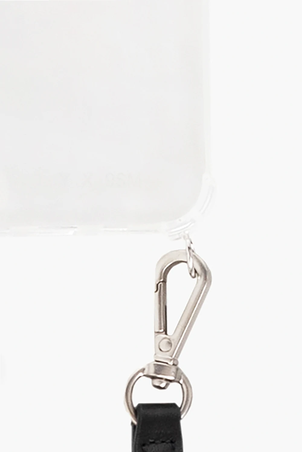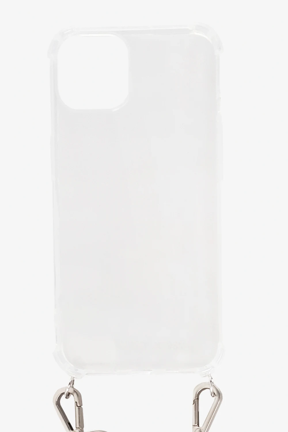 White, transparent iPhone 13 case from 1017 ALYX 9SM. Decorated with a logo print, this design features a leather strap with the brand’s signature Rollercoaster buckle in silver-tone and gold-tone.