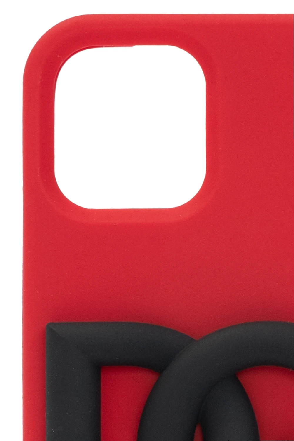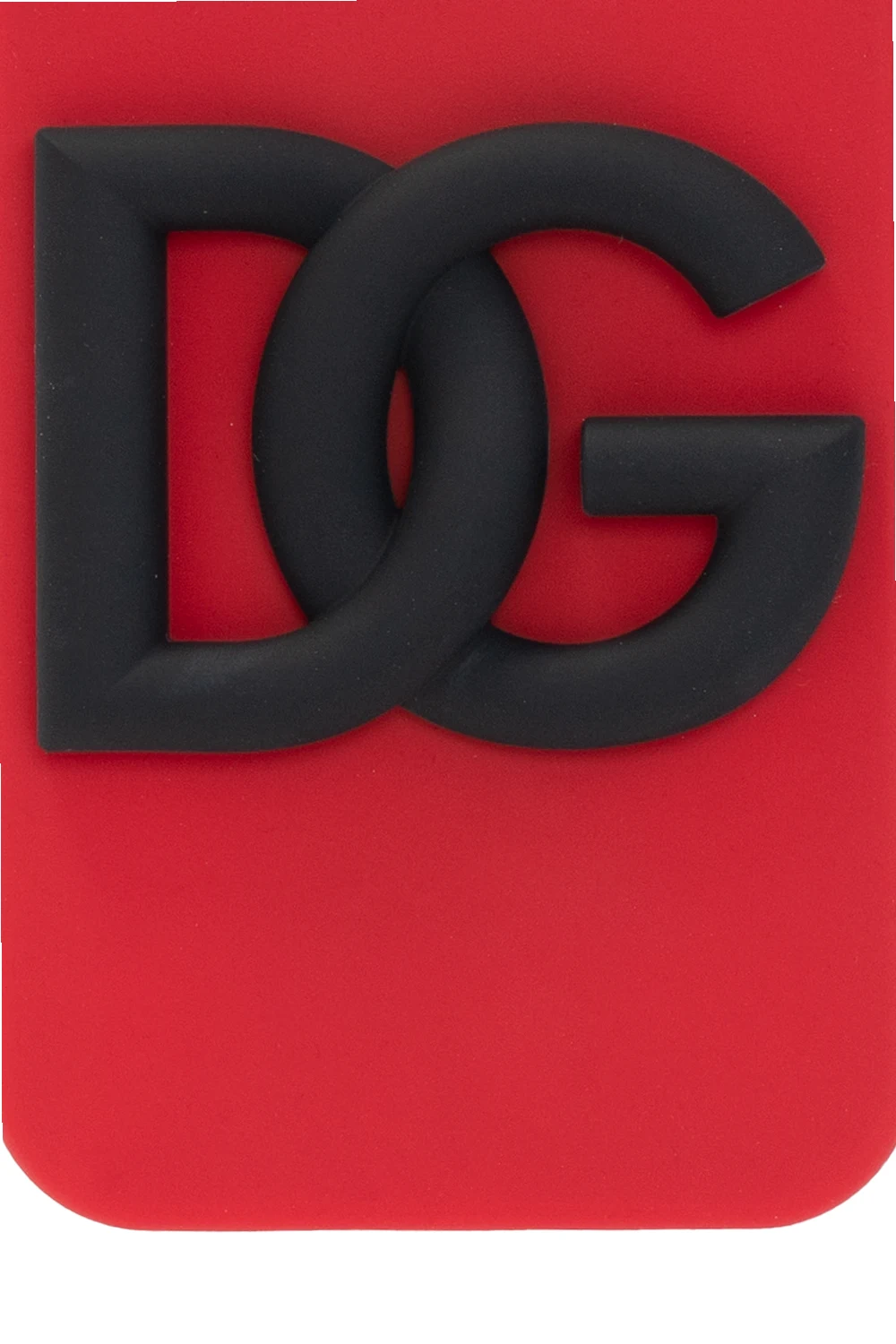 Red and black iPhone 12 Pro case from Dolce & Gabbana. Made of rubber, this model is decorated with a raised logo pattern in black.