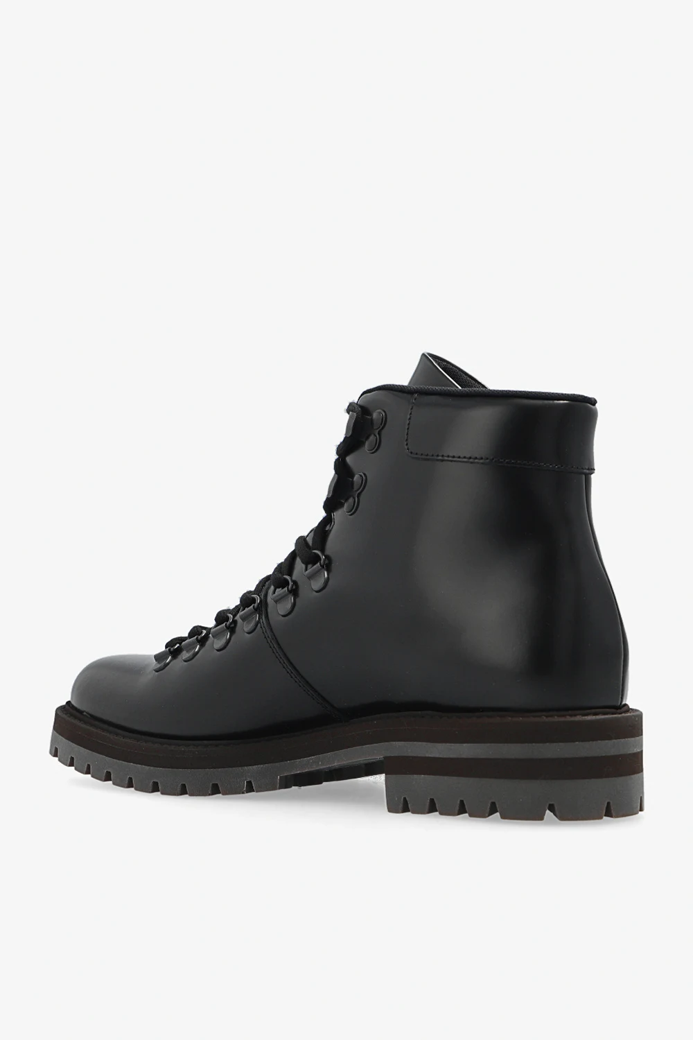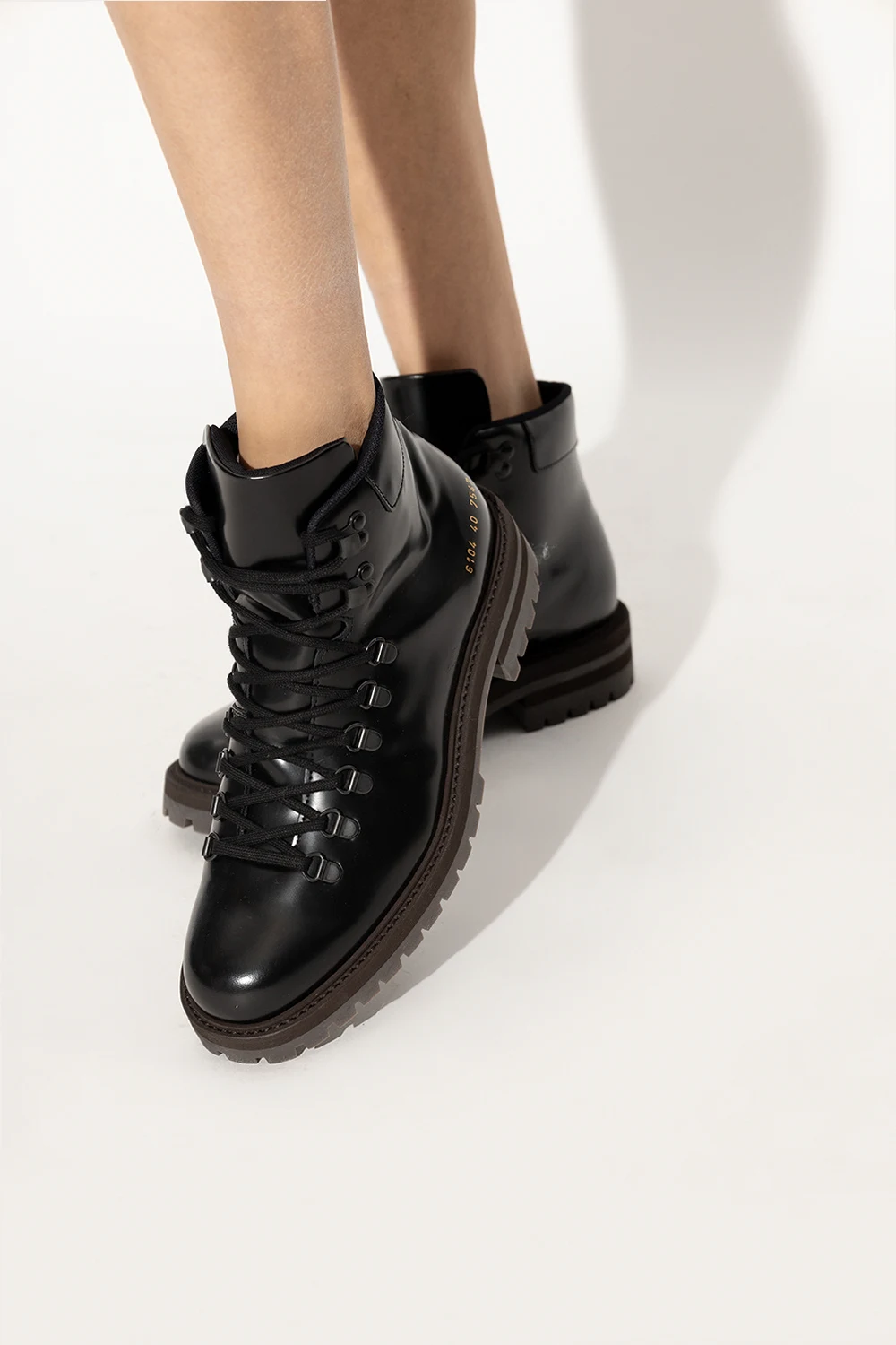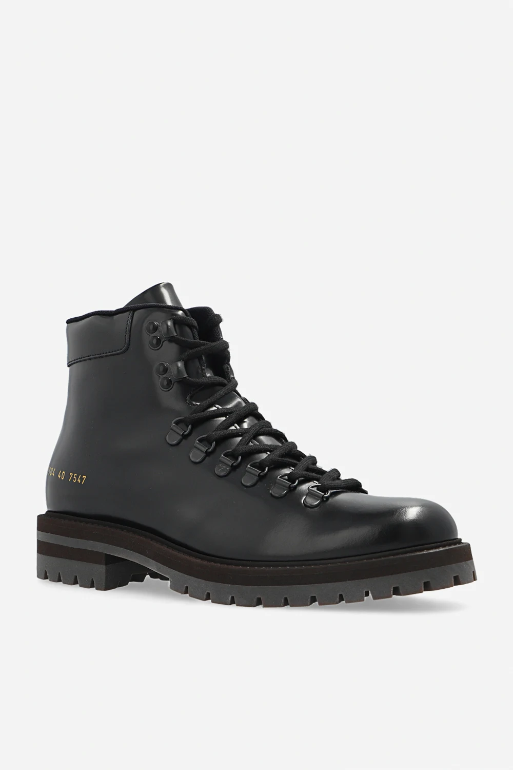 Black ‘Hiking’ boots from Common Projects. Crafted from smooth leather, this lace-up model sits on a dark brown rubber sole and features a gold-tone graphic print. Swappable shoelaces included.