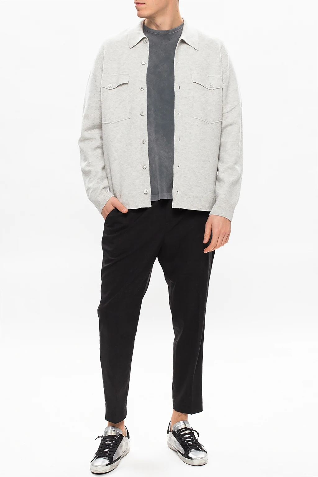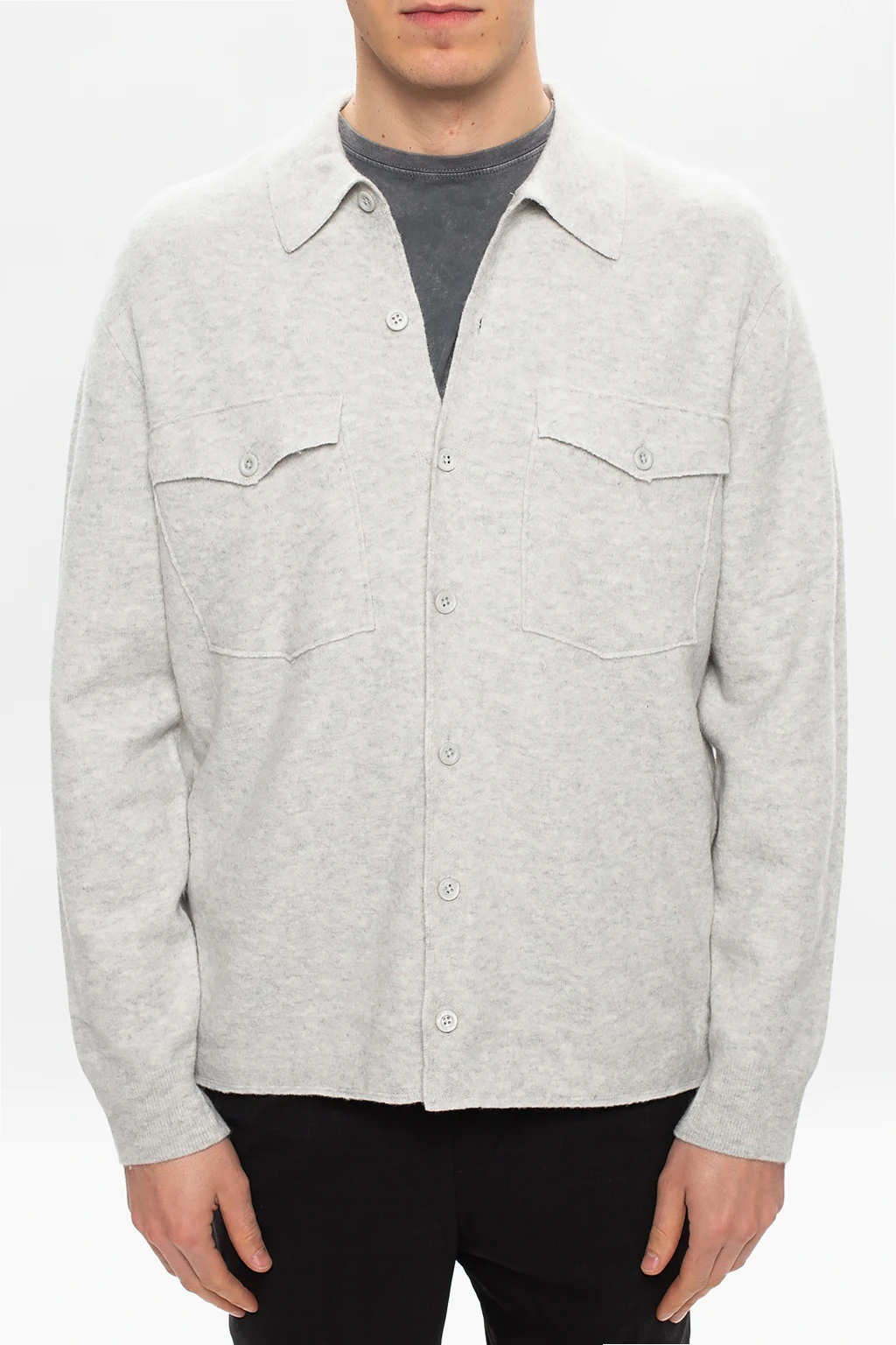 Grey 'Lori' cardigan from AllSaints. Knitted from wool, this style fastens via buttons and employs two button-fastened flapped pockets on the front and long sleeves with elasticated cuffs.
