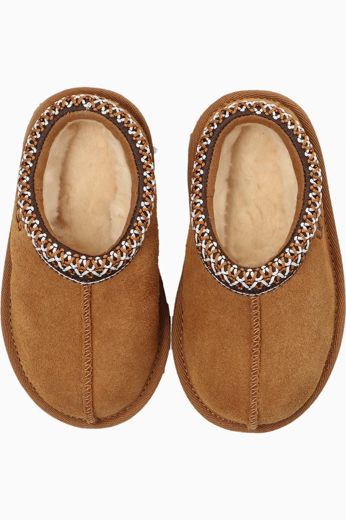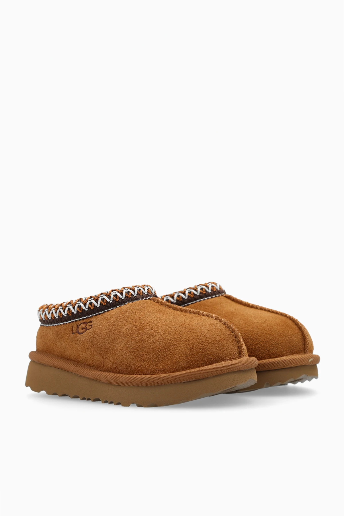 Black ‘Tasman II’ slides from UGG Kids. Made from suede, this pair features an embossed logo, decorative woven details, UGGplush™ lining made from wool and recycled materials as well as a beige EVA sole.