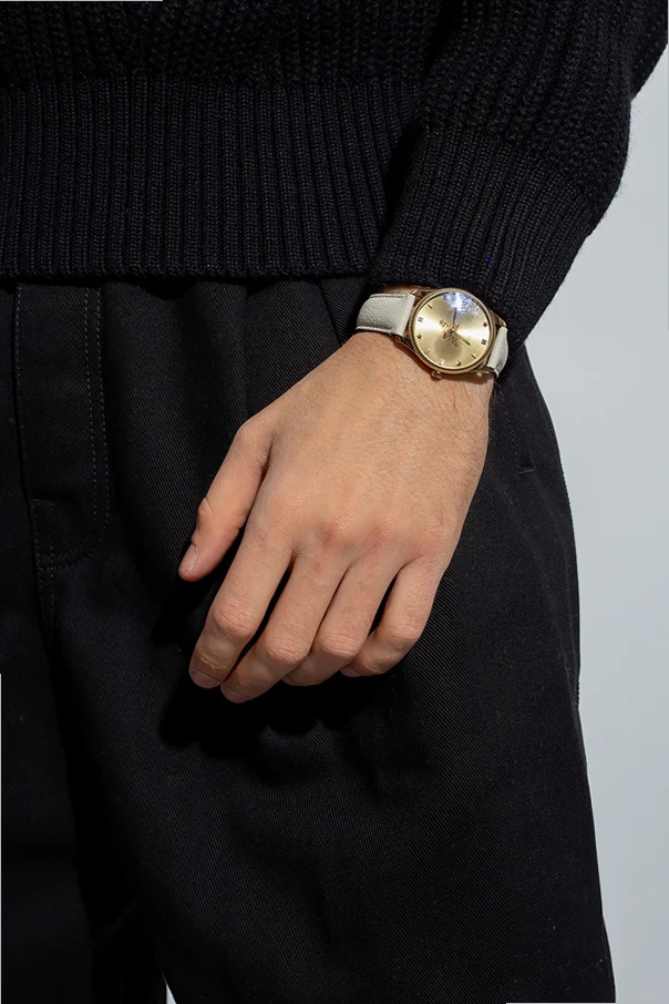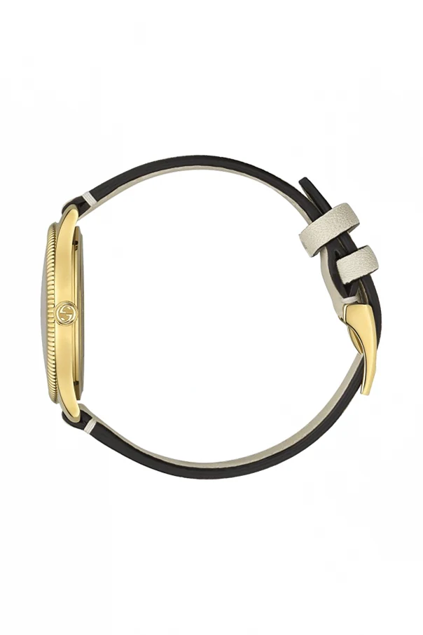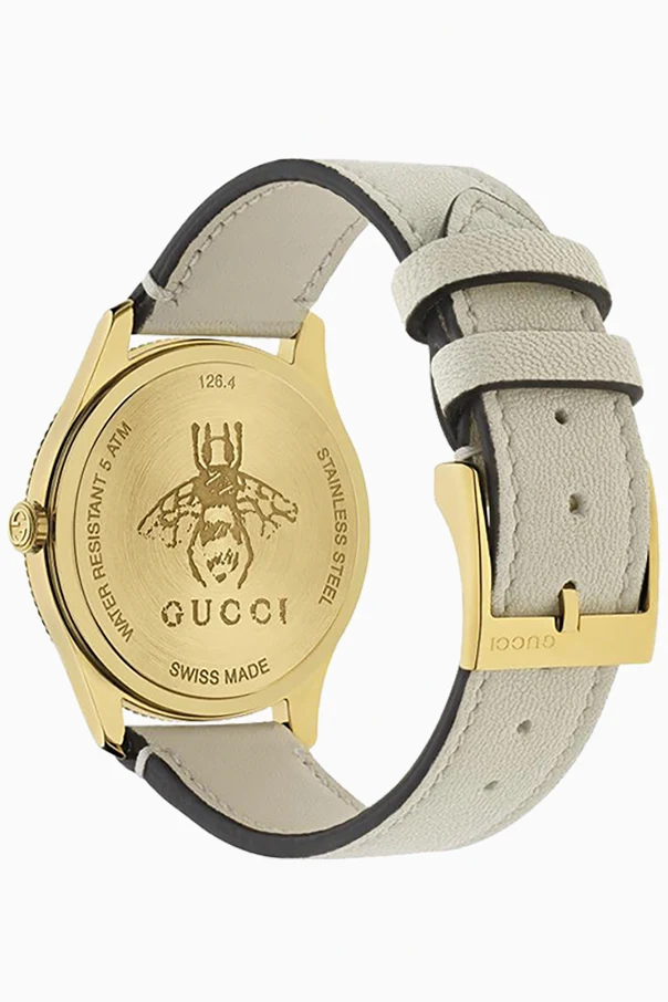 Cream and gold-tone ‘G-Timeless’ watch with a leather strap from Gucci. Crafted in the Swiss Kering watch manufacture, it is characterized by an innovative 36mm case, the brand's iconic bee that appears as a subtle detail on one of the watch's hands, sapphire glass with antireflective coating and polished and satin steel finish.