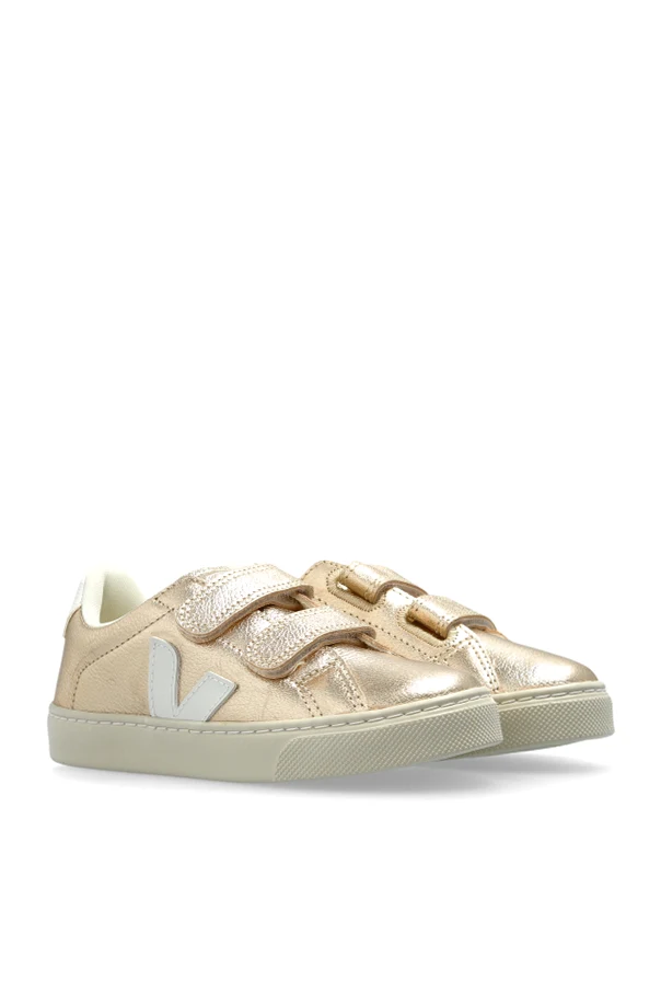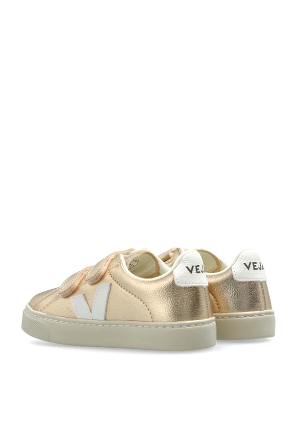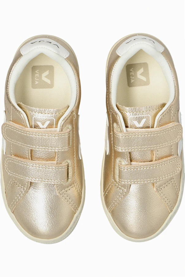 Introducing the SMALL ESPLAR LEATHER sneakers from the exclusive Veja Kids collection, a testament to elegance and contemporary flair. These children's athletic shoes, dominated by a striking gold hue, exude an air of sophistication and fashion-forward design.
