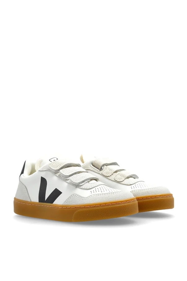 Discover a harmonious blend of sophistication and playful spirit with the SMALL V-90 O.T. LEATHER sneakers from the exclusive Veja Kids collection. Meticulously crafted in Brazil, these sneakers feature a timeless low-top silhouette and an upper made from premium white genuine leather, enhanced with suede panels on the three wide hook-and-loop straps for effortless wear.