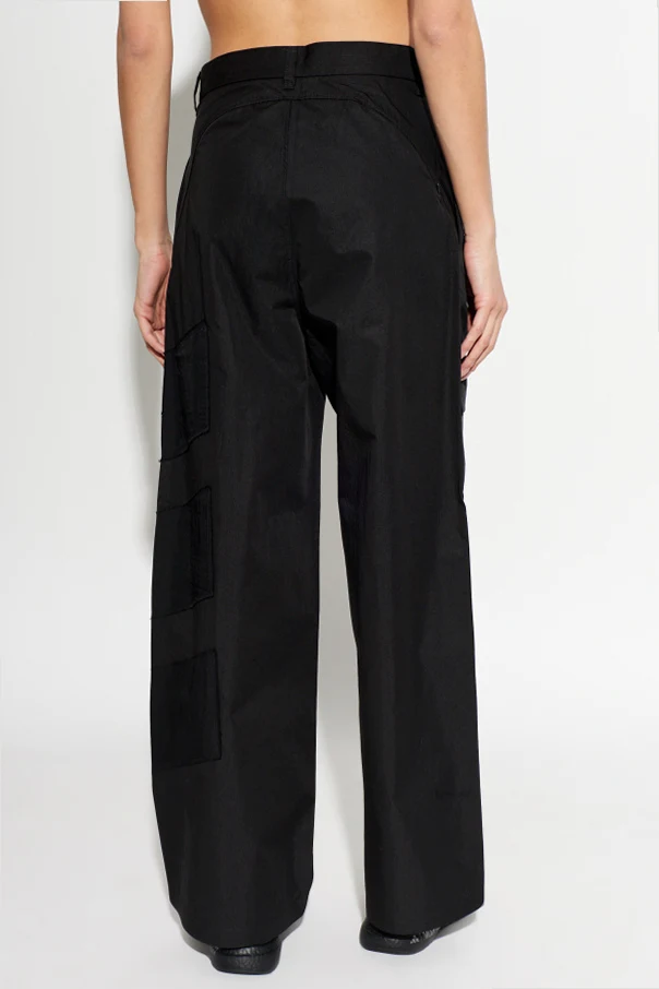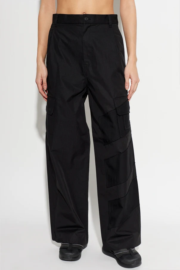 Distinctive cargo pockets adorn each side, skillfully merging utility with style. Decorative, subtly angled fabric bands accent the front legs, while artful segmental topstitching enhances the modern design. Enduring and sophisticated, these trousers embody effortless, contemporary luxury.