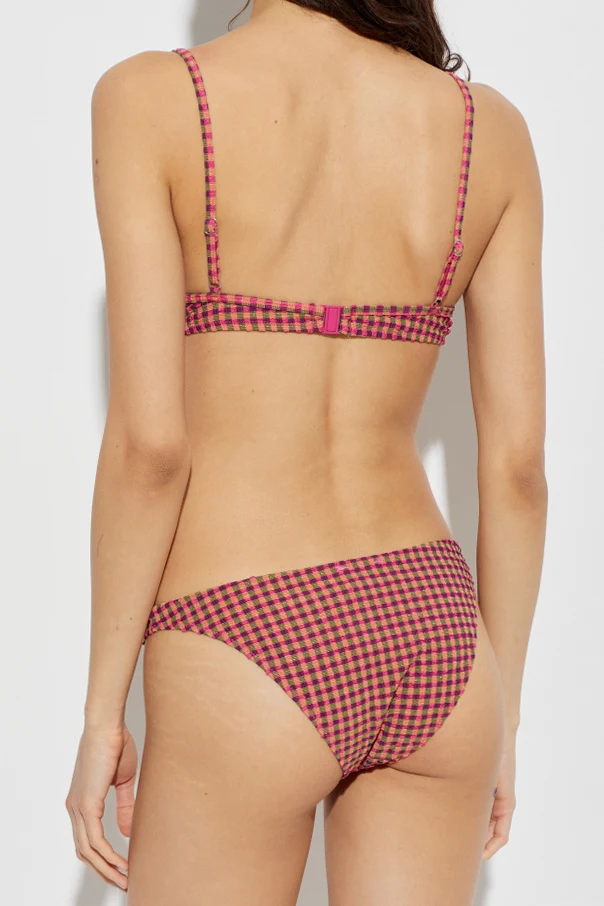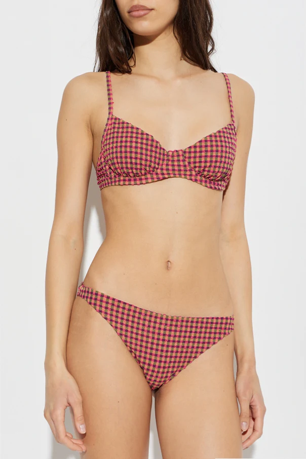 Featuring a striking gingham check pattern in vibrant shades of pink, green, and deep burgundy , this bikini top makes an unmistakable style statement. Designed with structured cups and adjustable classic straps, it promises a bespoke fit and reliable support. The minimalist silhouette is enhanced by a secure back clasp, seamlessly balancing comfort with an understated, yet timeless appeal—free from visible logos or extraneous embellishments.