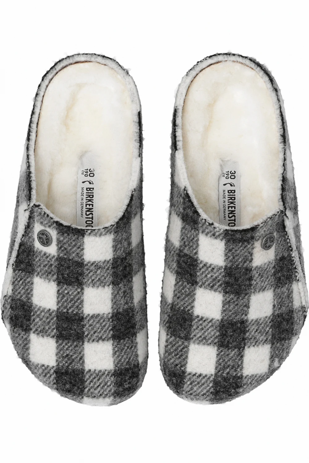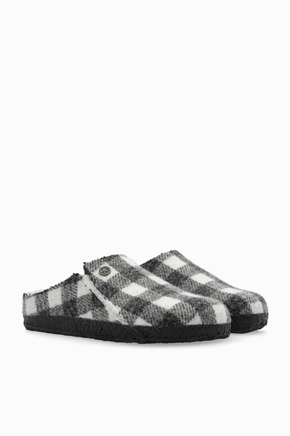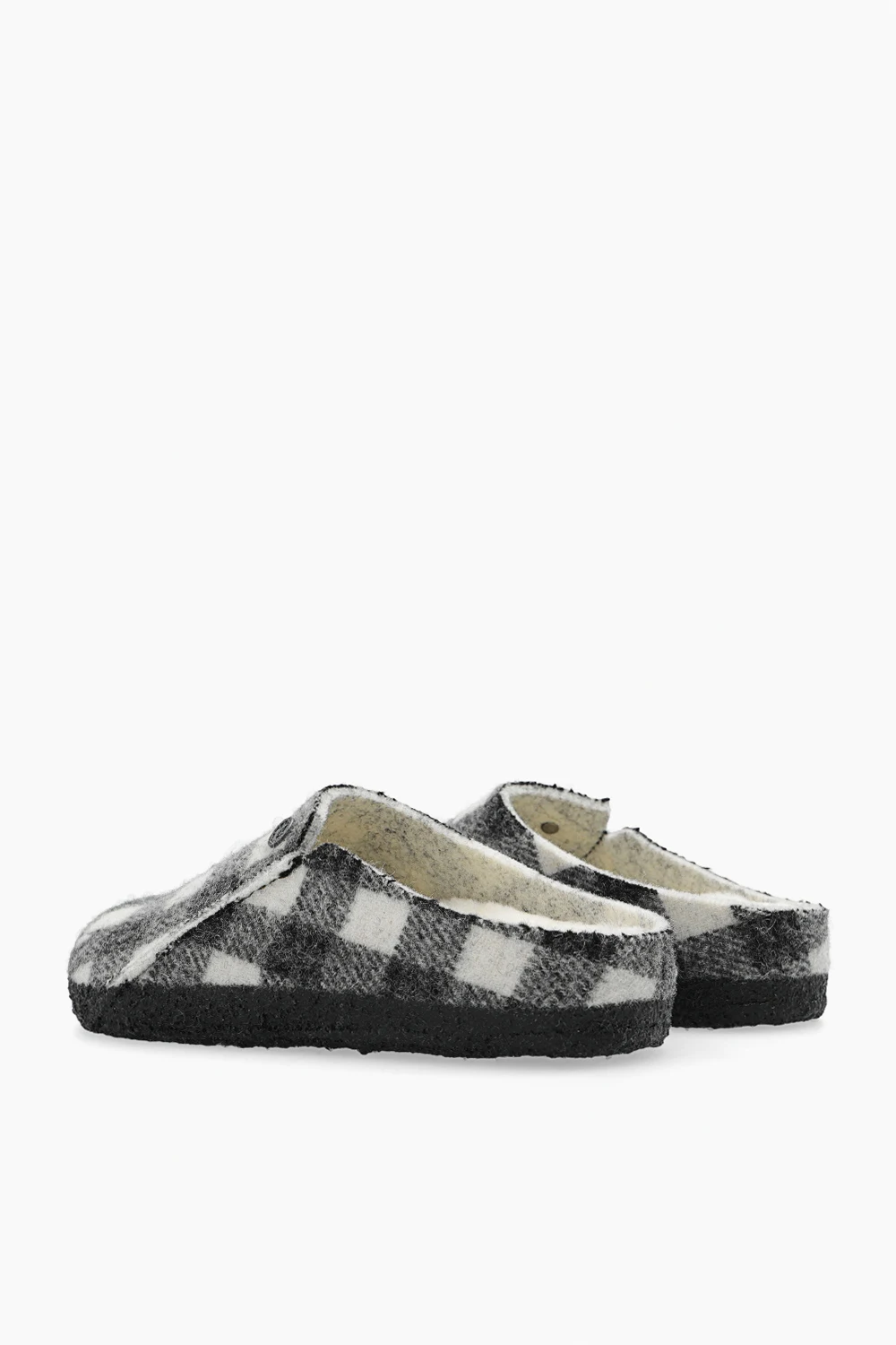 Grey and white ‘Zermatt’ from Birkenstock. Crafted from a wool blend, this pair features lamb fur lining, check pattern and black latex sole.