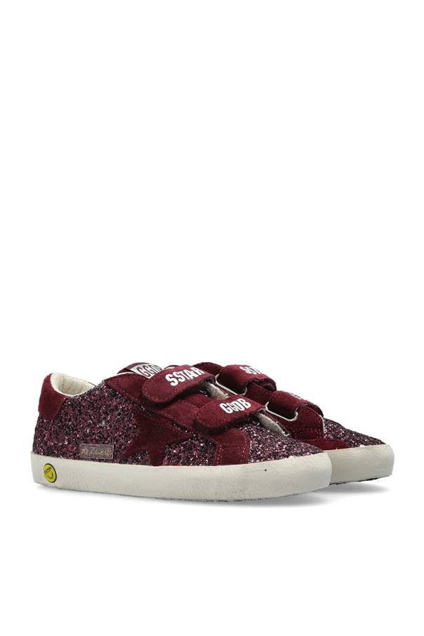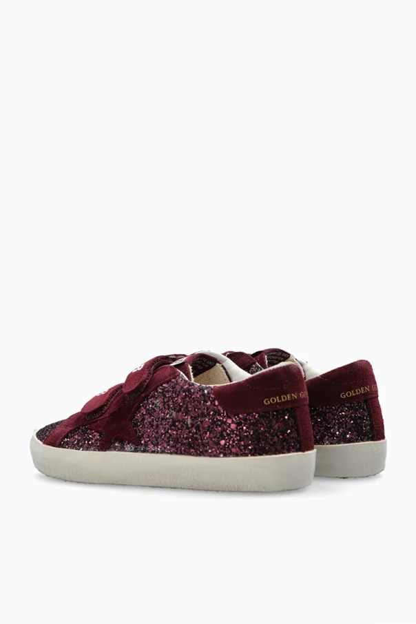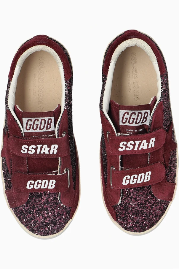 The OLD SCHOOL Sneakers from Golden Goose Kids exude effortless charm with their classic low-top silhouette and rounded toe, reimagined for the spirited energy of youth. Crafted from opulent burgundy suede and shimmering textile adorned with brilliant glitter crystals, each pair radiates distinction and playful sophistication. The dual hook-and-loop straps, emblazoned with crisp white "GGDB" and "SSTAR" prints, ensure both ease and a striking visual accent, while the golden "GOLDEN GOOSE" lettering at the heel pays homage to the brand’s renowned Italian heritage.