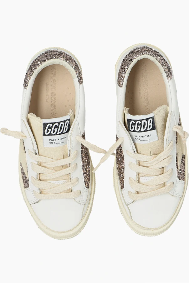 Introducing the May With Double Quarter sneakers by Golden Goose Kids —a sublime fusion of Italian artistry and contemporary urban style. Meticulously crafted from premium white leather and contrasting glimmering glitter panels, these low-top sneakers captivate with their classic silhouette and playful energy. The iconic star motif, gracefully adorning the sides, is accented by sparkling glitter embellishments at the heel and side panels, evoking sophistication with a twist of exuberance.
