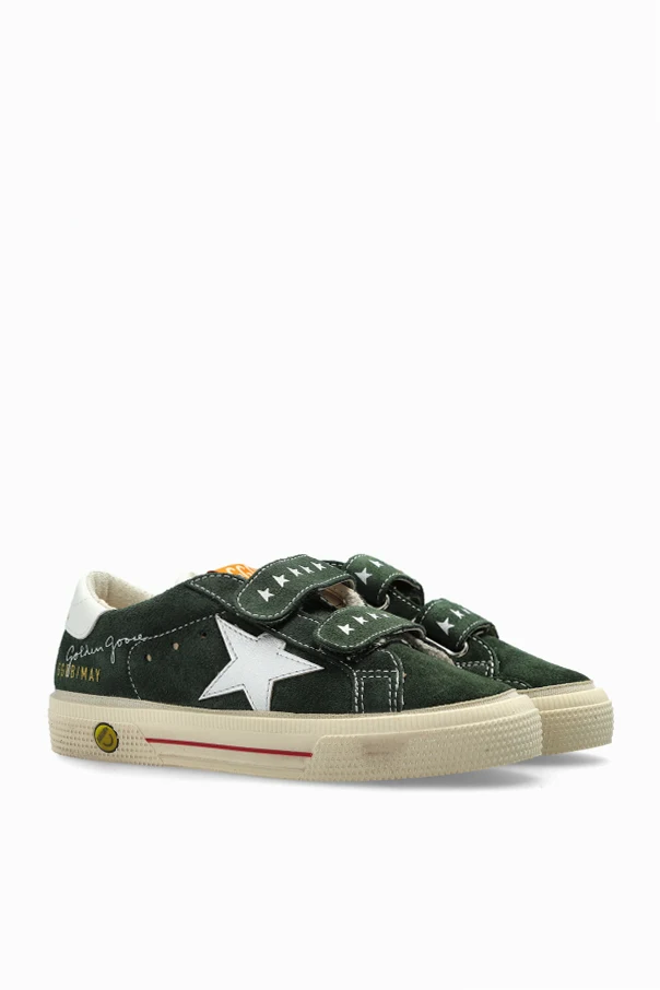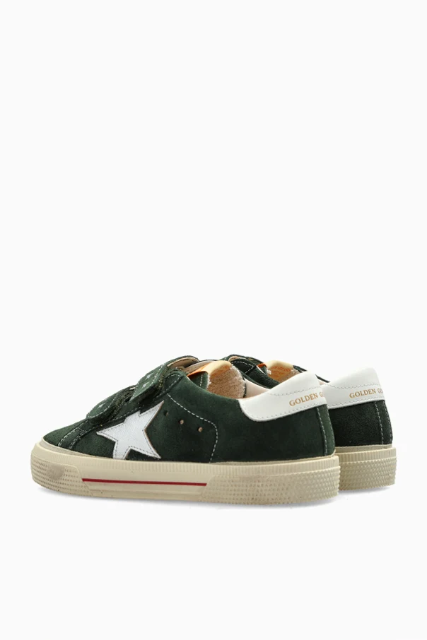 The May School sneakers by Golden Goose Kids eloquently merge youthful energy with refined Italian craftsmanship. Crafted from premium, matte-finish suede in a distinctive green hue, these classic low-cut sneakers showcase meticulous stitching and a luxurious texture emblematic of superior materials. Each pair features a rounded toe and a softly aged ivory sole, elegantly accented with a subtle red stripe and understated gold details.