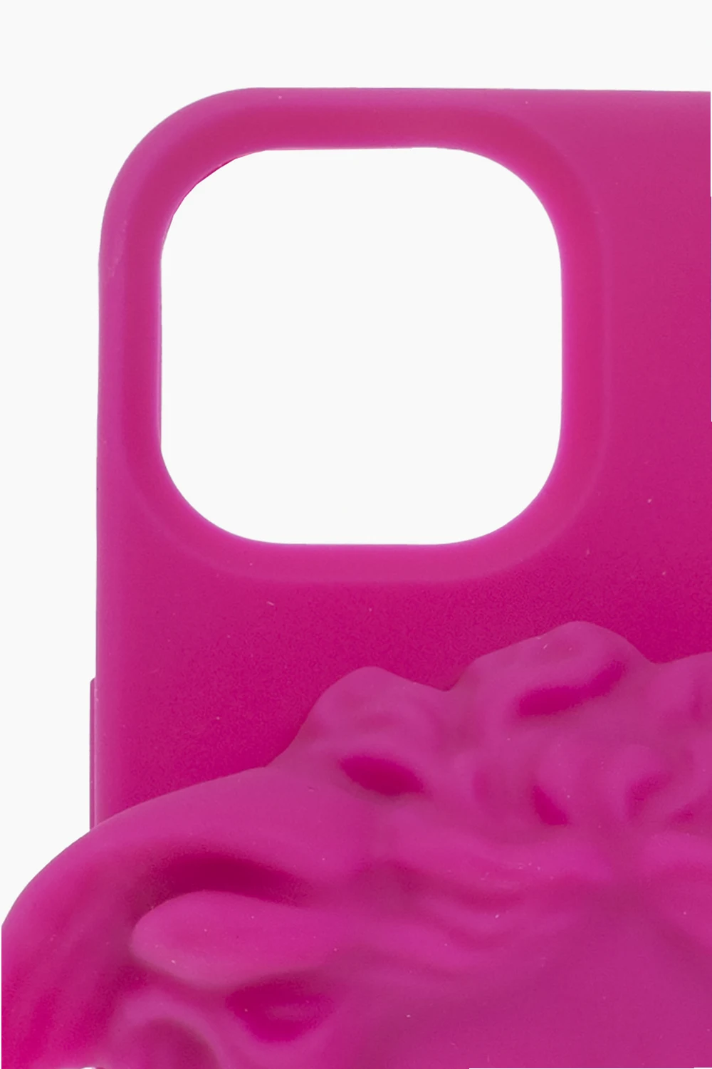 Pink iPhone 13 case from Versace. Made of silicone, this item features a logo detail and the iconic raised Medusa head.