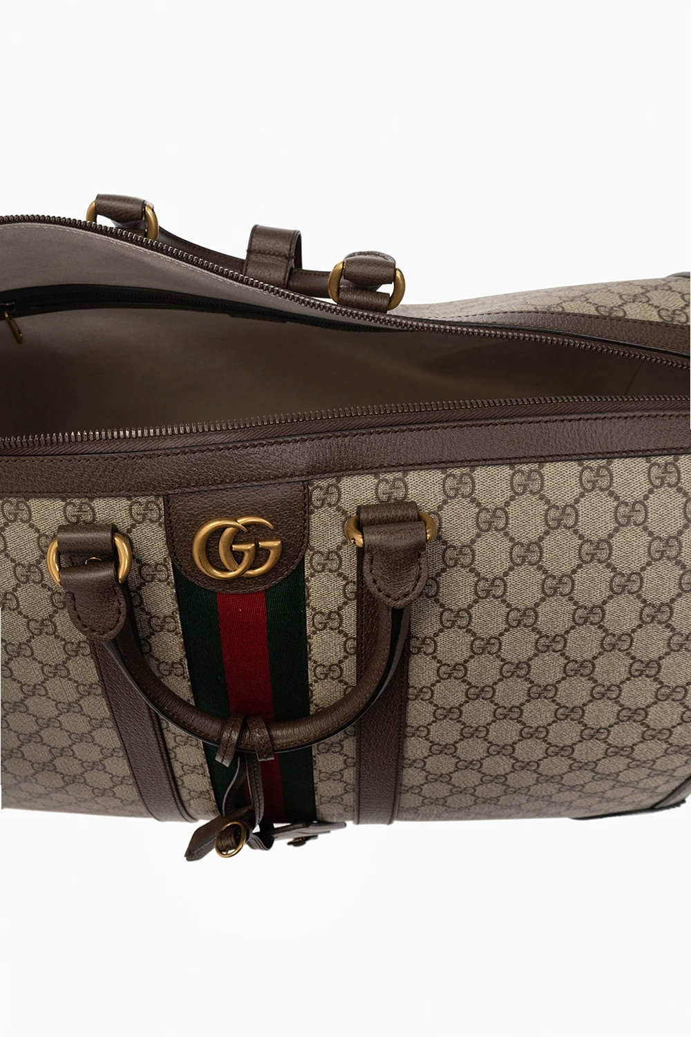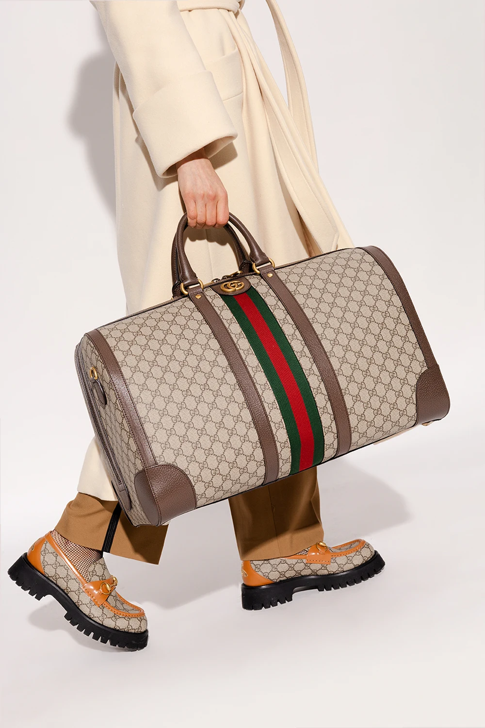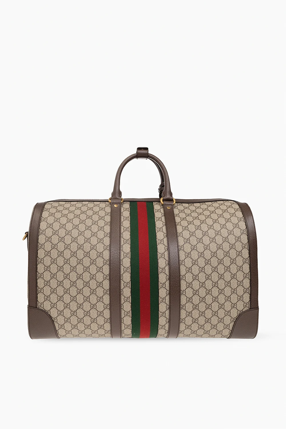 Beige and brown ’Savoy Large’ duffel bag from Gucci. Crafted from ‘GG Originals’ canvas, this design features a two-way zip fastening, leather trims, the brand\'s signature green and red ‘Web’ stripe detailing, logo hardware on the front, two half-round handles, a detachable and adjustable shoulder strap, antiqued gold-tone metal elements and one internal compartment with two zip pockets.