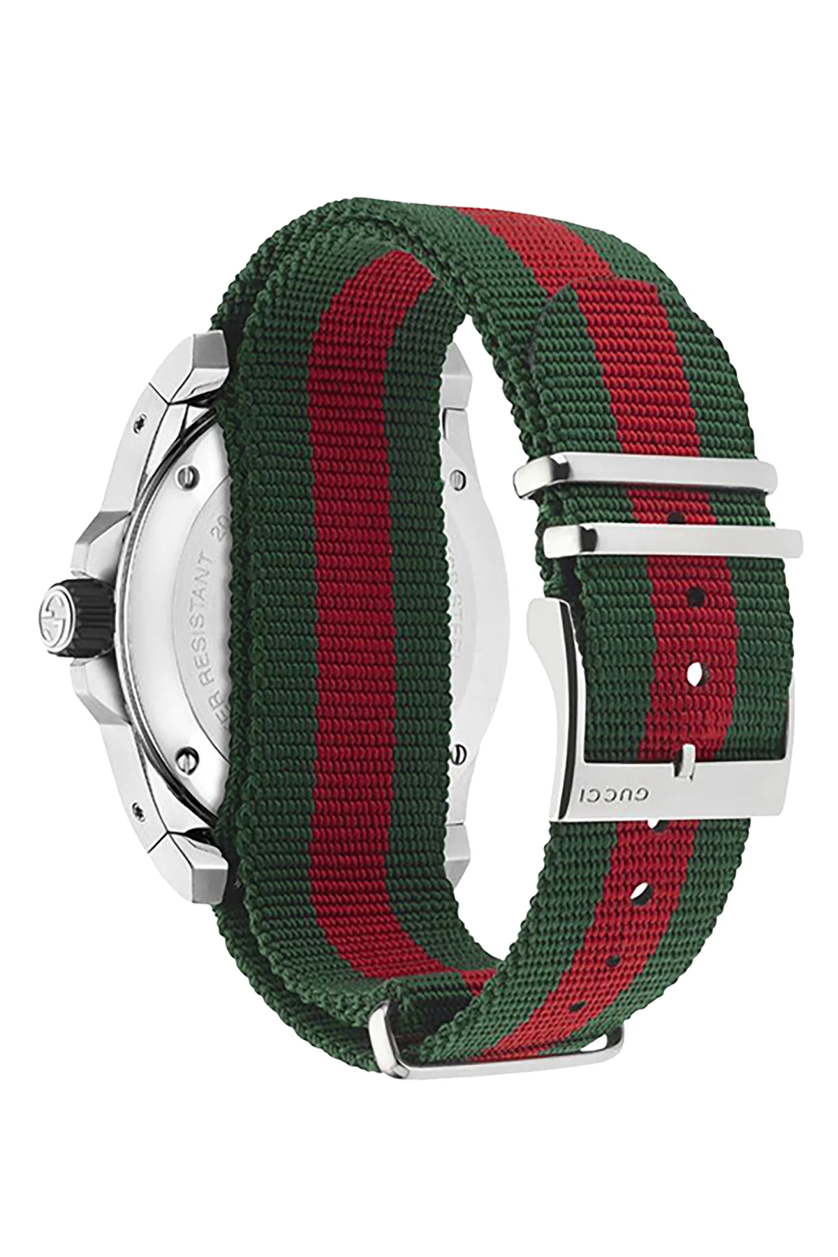Silver-tone and black ‘Dive’ watch from Gucci. Made of stainless steel, this item features a dial with a logo, strap with a green and red Web stripe and a quartz movement. Water resistant up to 200 m.