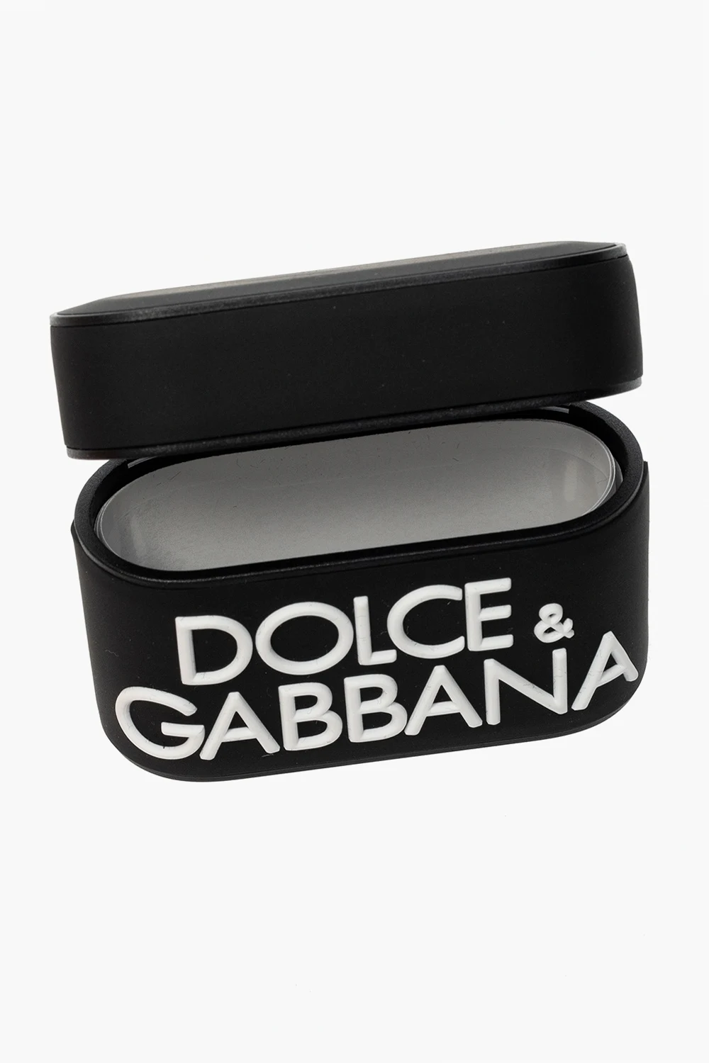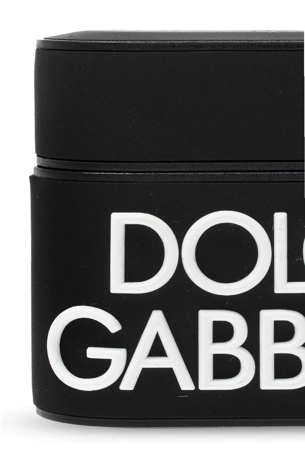 Black AirPods case from Dolce & Gabbana emblazoned with white tactile branding.