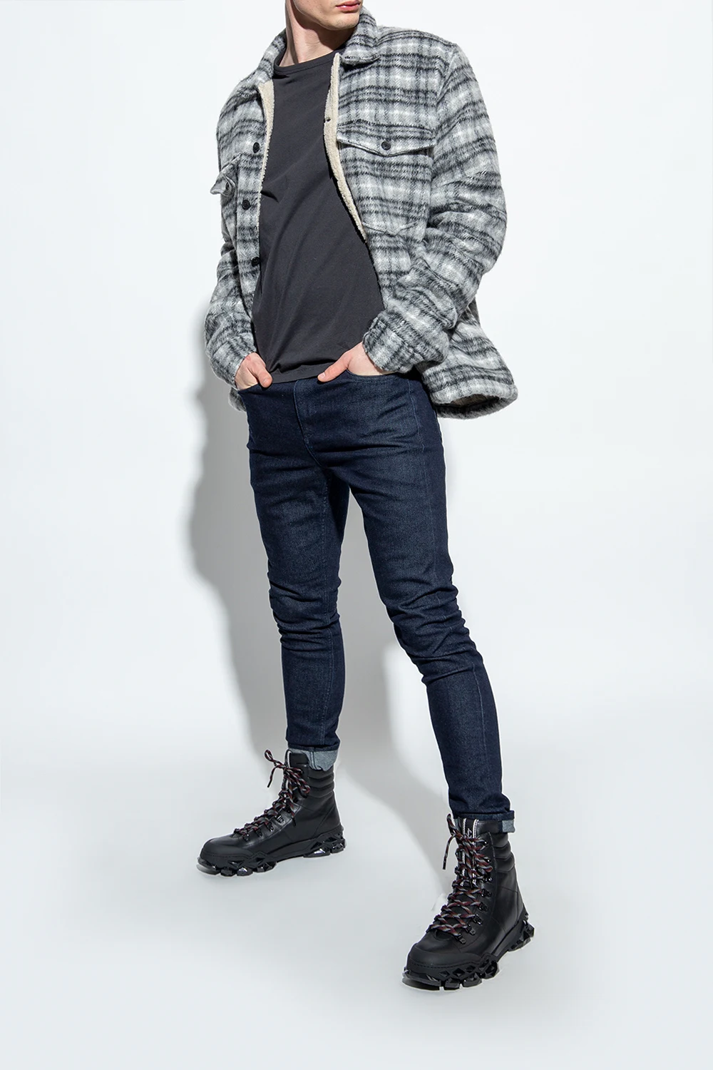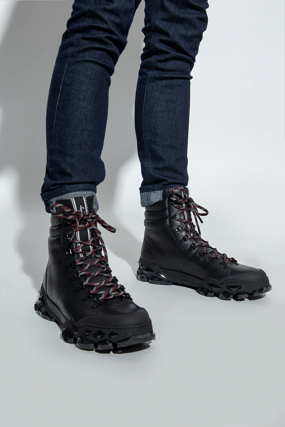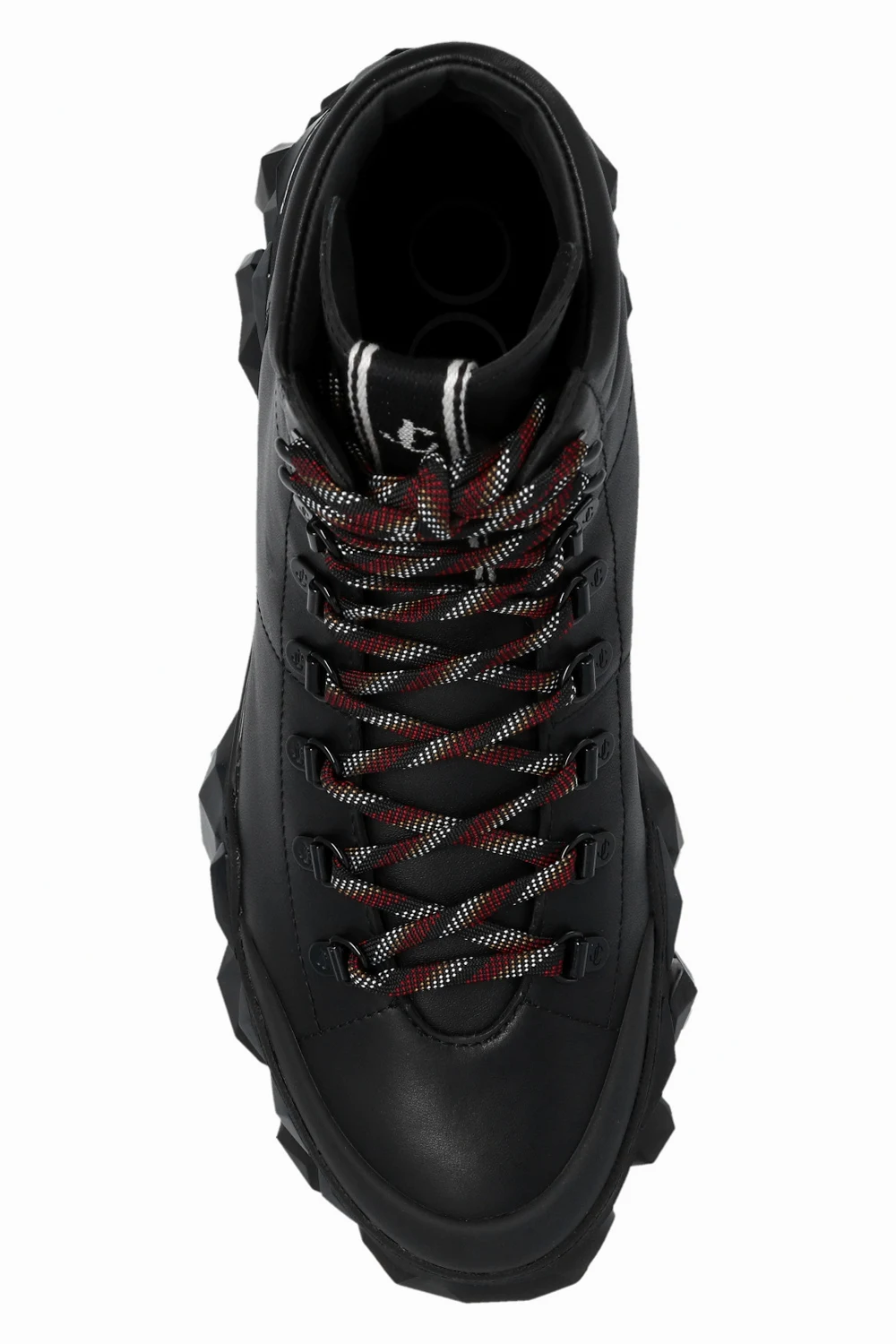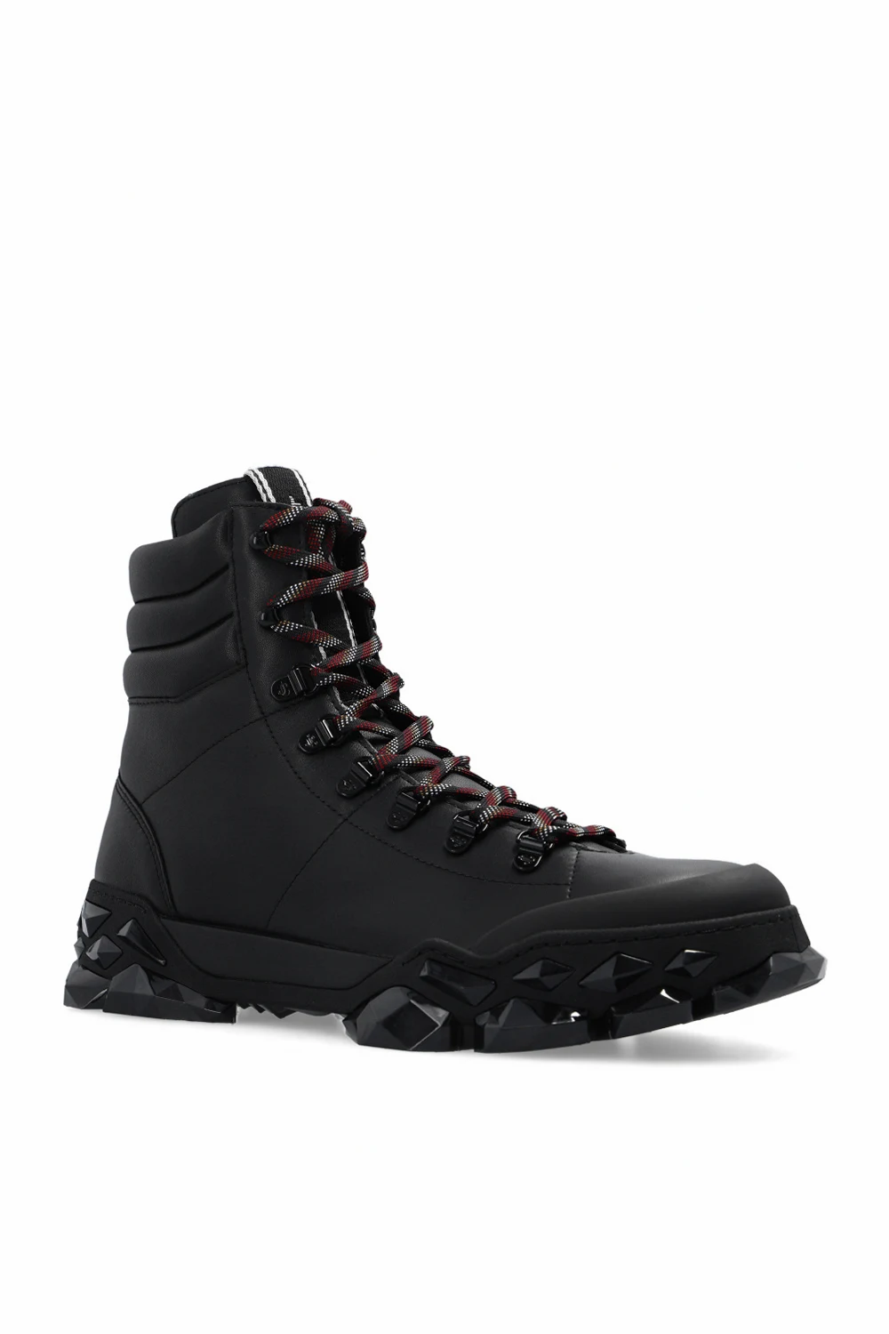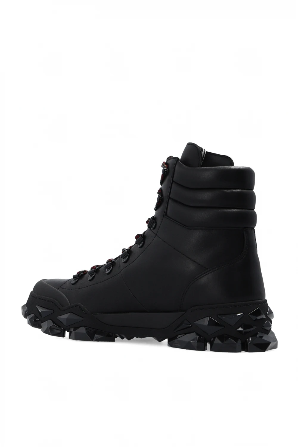 Black ‘Diamond X’ ankle boots from Jimmy Choo. Made of leather, this model features a slip-on silhouette, a monogram patch on the tongue and a black multifaceted rubber sole that resembles diamonds set in stone.