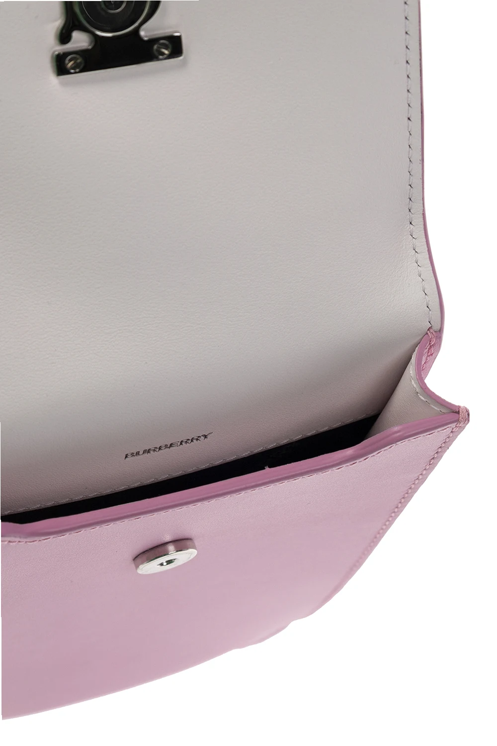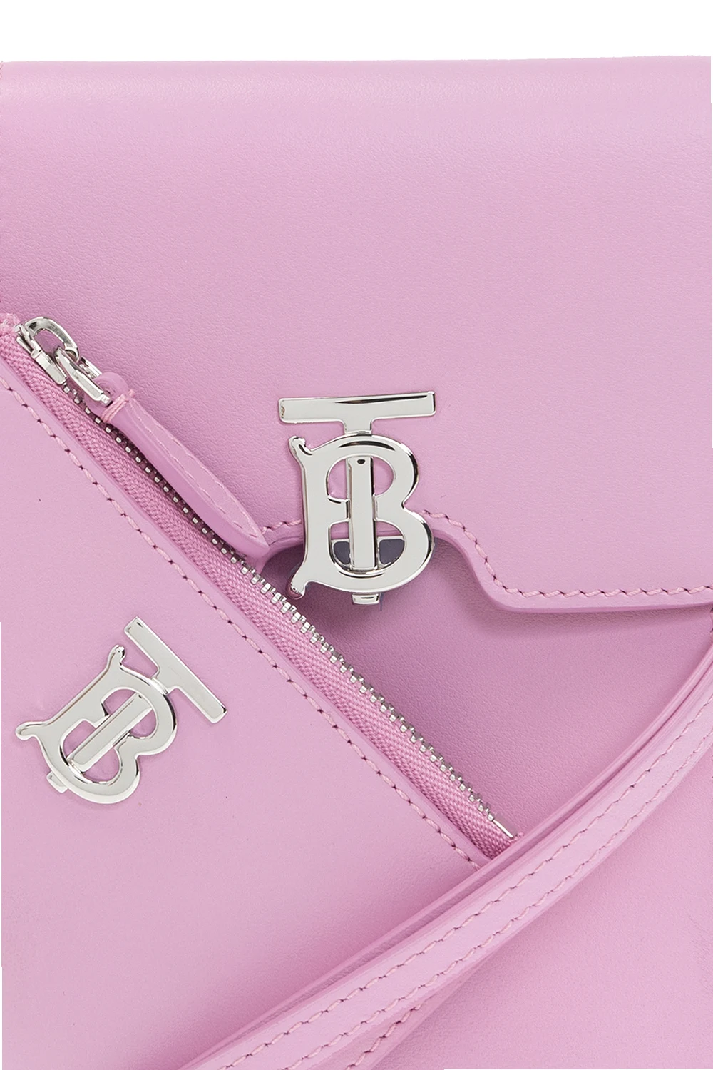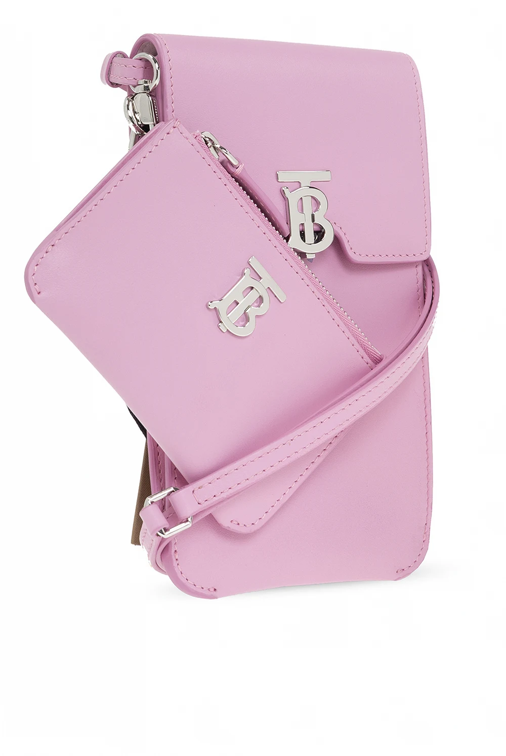 Pink phone holder and a pouch on a detachable strap from Burberry. Crafted from calf leather, they showcase silver-tone metal hardware, including a logo plaque. The phone holder has a magnetic press stud closure and one internal compartment. The pouch has a zip fastening.